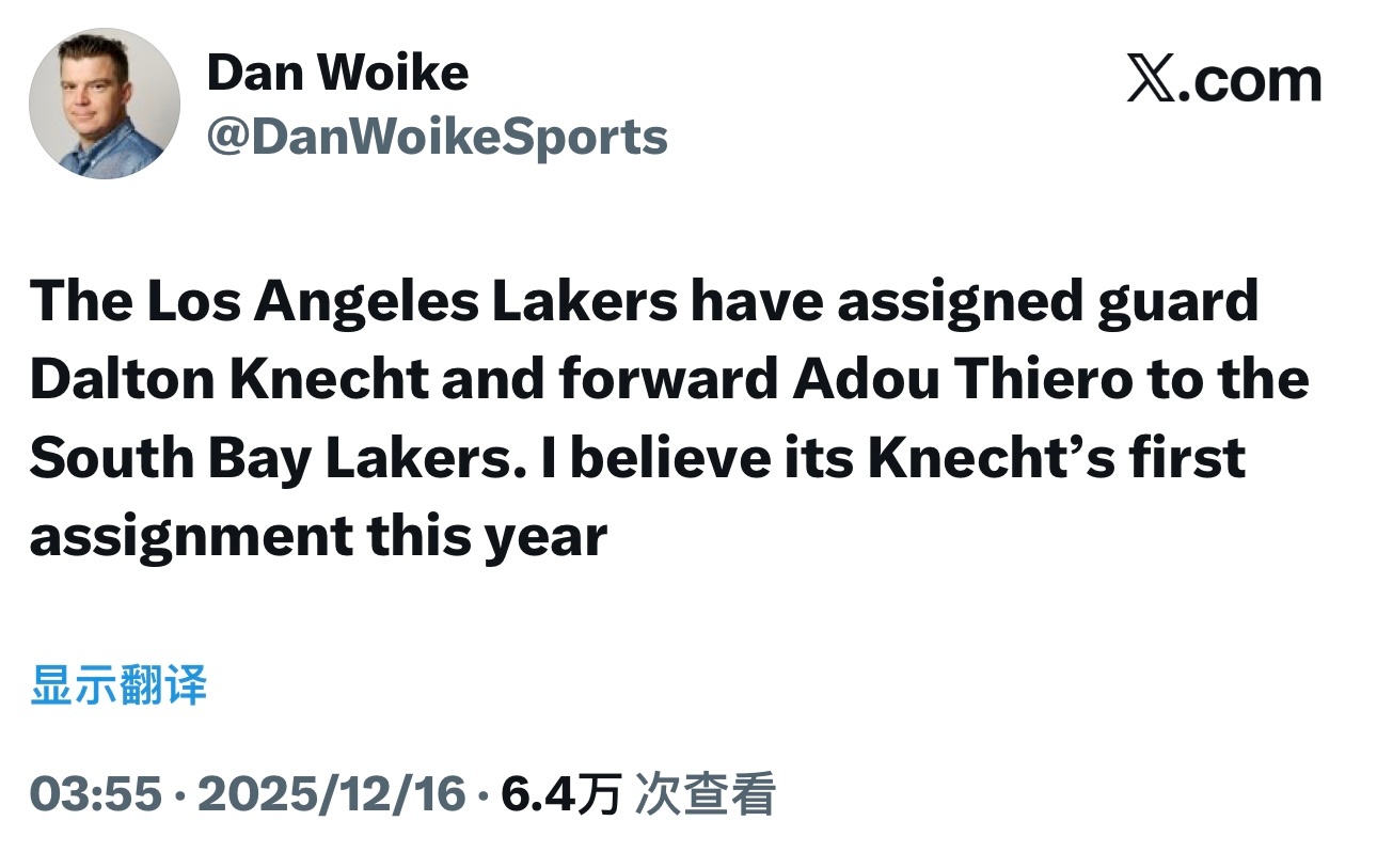 克内克特和蒂耶罗被下放至南湾湖人,这是克内克特本赛季首次下放。