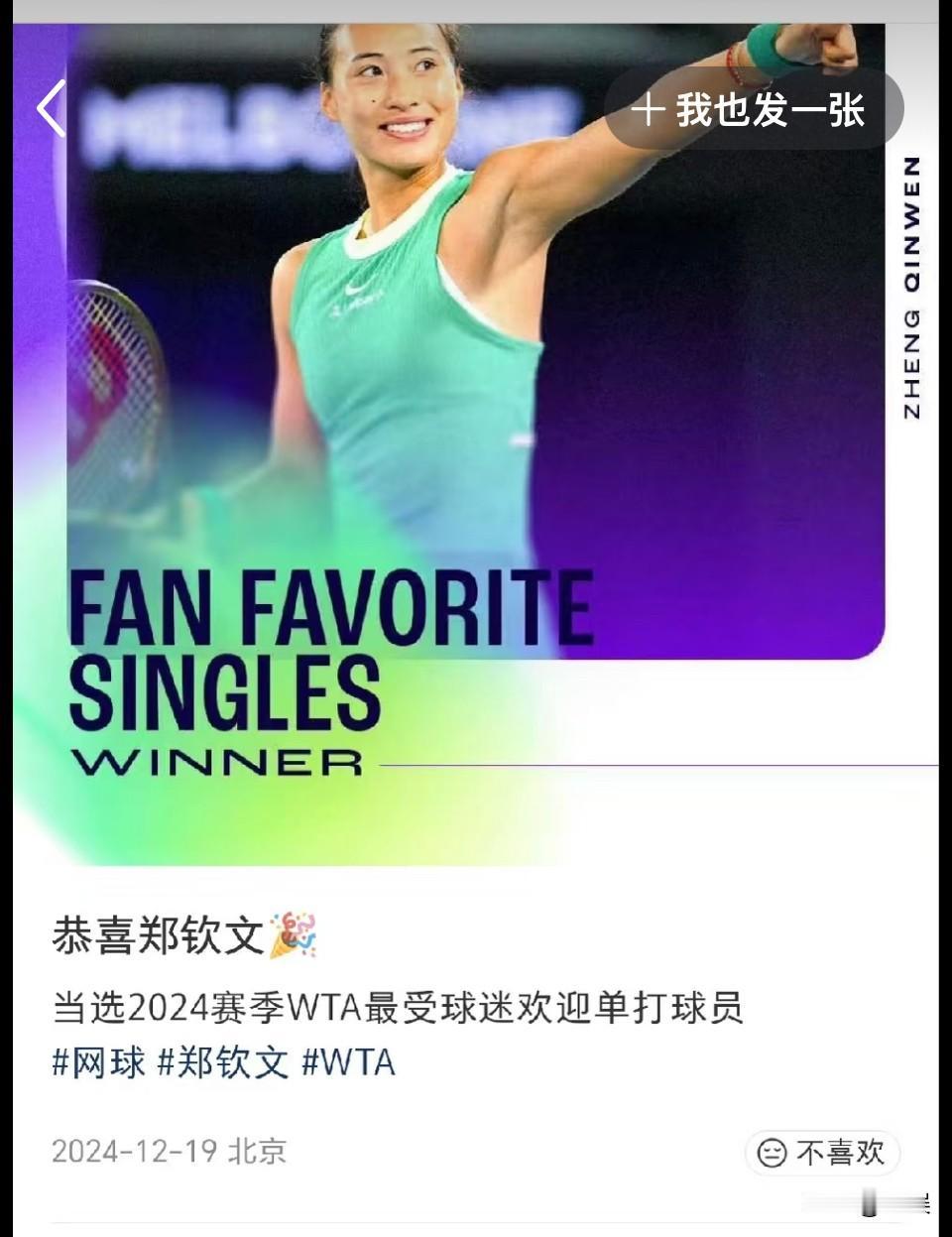 恭喜郑钦文当选年度最受欢迎单打球员 场上霸气十足,场下亲和可爱,这样优秀的钦文,谁人不喜、哪个不爱。 我文蝉联这个奖项,去年我就在说这个奖以后每年都是我文的,人气王实至名归😘半年没打球都这么火,文真的是人气女王!郑钦文