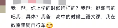 我:爸,你上学的时候啥样的? 我爸:挺淘气的吧 我:具体? 我爸:高中的时候上语文课,我在教室里骑自行车~