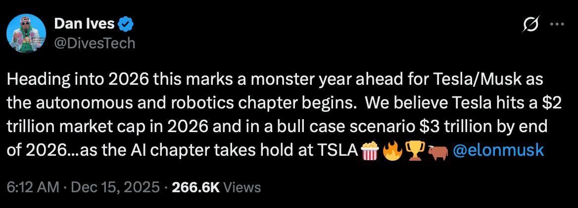 🚨特斯拉有望迎来爆发式增长的一年,艾夫斯预测其市值将达到3万亿美元。 Wedbush首席分析师DanIves更加看好特斯拉的上涨前景,称2026年可能是特斯拉的突破之年,因为该公司在人工智能,自动驾驶和机器人技术方面的努力将更接近真正的商业化。 丹表示,特斯拉到2026年市值可能达到2万亿美元,乐观估计到今年年底市值甚至可能高达3万亿美元。 他将即将到来的时期描述为一个转折点,并认为特斯拉的人工智能篇章正在以市场仍然低估的方式开始站稳脚跟。 艾夫斯重申了他对特斯拉股票的"跑赢大盘"评级,并维持每股600美元的目标价。 他表示,特斯拉在自动驾驶和机器人领域的雄心壮志不再是抽象的概念,而是正在走向部署的项目,这预示着他所说的"辉煌的一年"即将到来。 特斯拉最近在奥斯汀进行的自动驾驶汽车测试进一步增强了这种乐观情绪。 周末期间,有人发现多辆ModelY车型在公共道路上行驶,车内没有安全监控人员或其他乘客。 特斯拉尚未透露涉及多少辆车,也未透露是否采用了远程监控。 马斯克上周表示,安全监控人员将在三周内被移除,而这些目击事件表明,这一时间表可能已经开始实施。 特斯拉的人工智能驱动的未来发展速度比许多人预期的要快,而关于其估值的争论才刚刚开始。 来源:(@Teslarati/@DivesTech/@Tesla 🚨TESLA SET UP FOR MONSTER YEAR AS IVES FLAGS $3 TRILLION BULL CASE Wedbush’s top analyst Dan Ives is doubling down on Tesla’s upside, calling 2026 a potential breakout year as the company’s AI, autonomy, and robotics efforts move closer to real commercialization. Dan said Tesla could reach a $2 trillion market cap in 2026, with a bull case pushing as high as $3 trillion by the end of the year. He described the coming period as a turning point, arguing that Tesla’s AI chapter is beginning to take hold in a way the market still underestimates. Ives reiterated his Outperform rating on Tesla stock and kept his $600 per share price target. He said Tesla’s autonomy and robotics ambitions are no longer abstract ideas but programs moving toward deployment, setting up what he called a “monster year” ahead. Fueling that optimism are Tesla’s recent autonomous vehicle tests in Austin. Over the weekend, multiple Model Y vehicles were spotted driving on public roads without safety monitors or other occupants. Tesla has not disclosed how many vehicles are involved or whether remote monitoring is in place. Musk said last week that safety monitors would be removed within three weeks, and the sightings suggest that timeline may already be playing out. Tesla’s AI driven future is moving faster than many expected, and the valuation debate is just getting started. Source: @Teslarati / @DivesTech / @Tesla