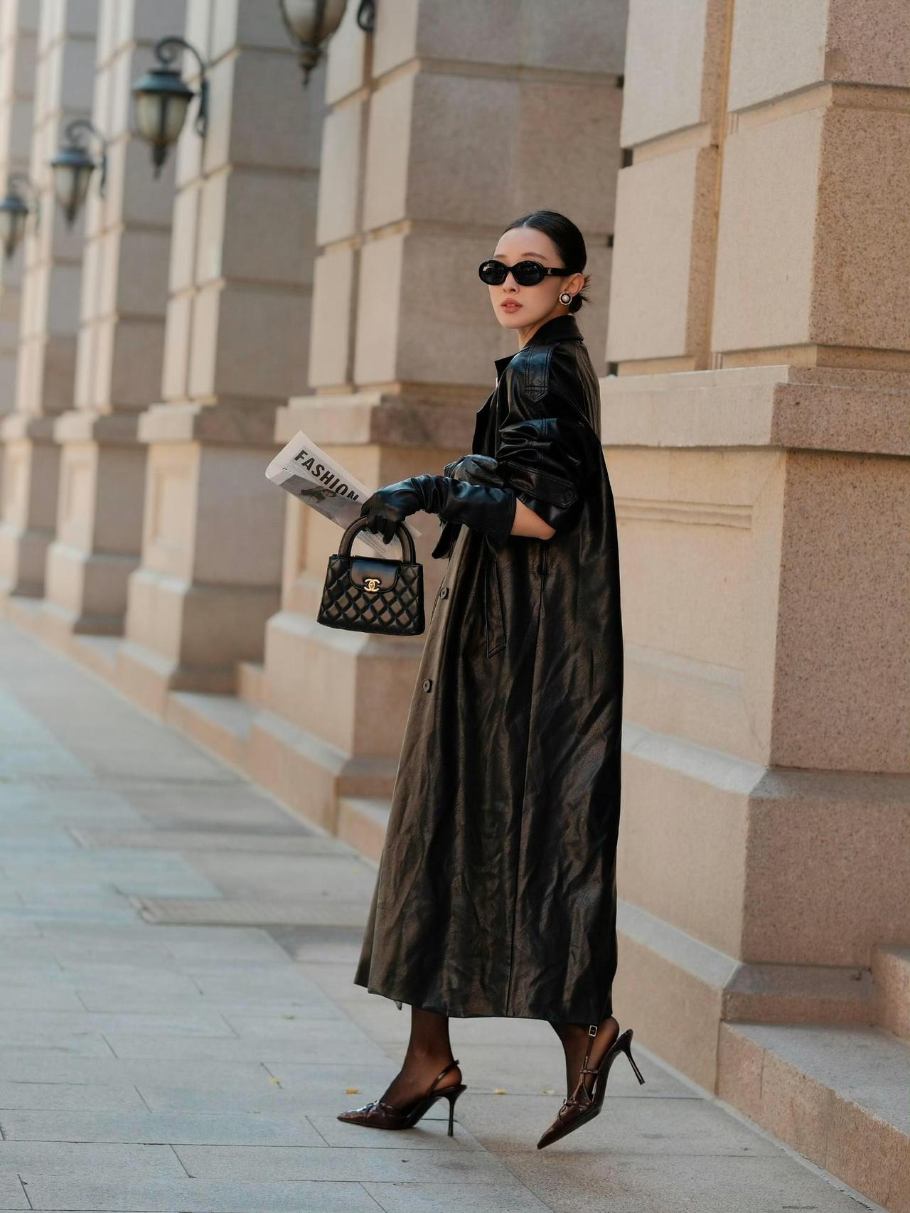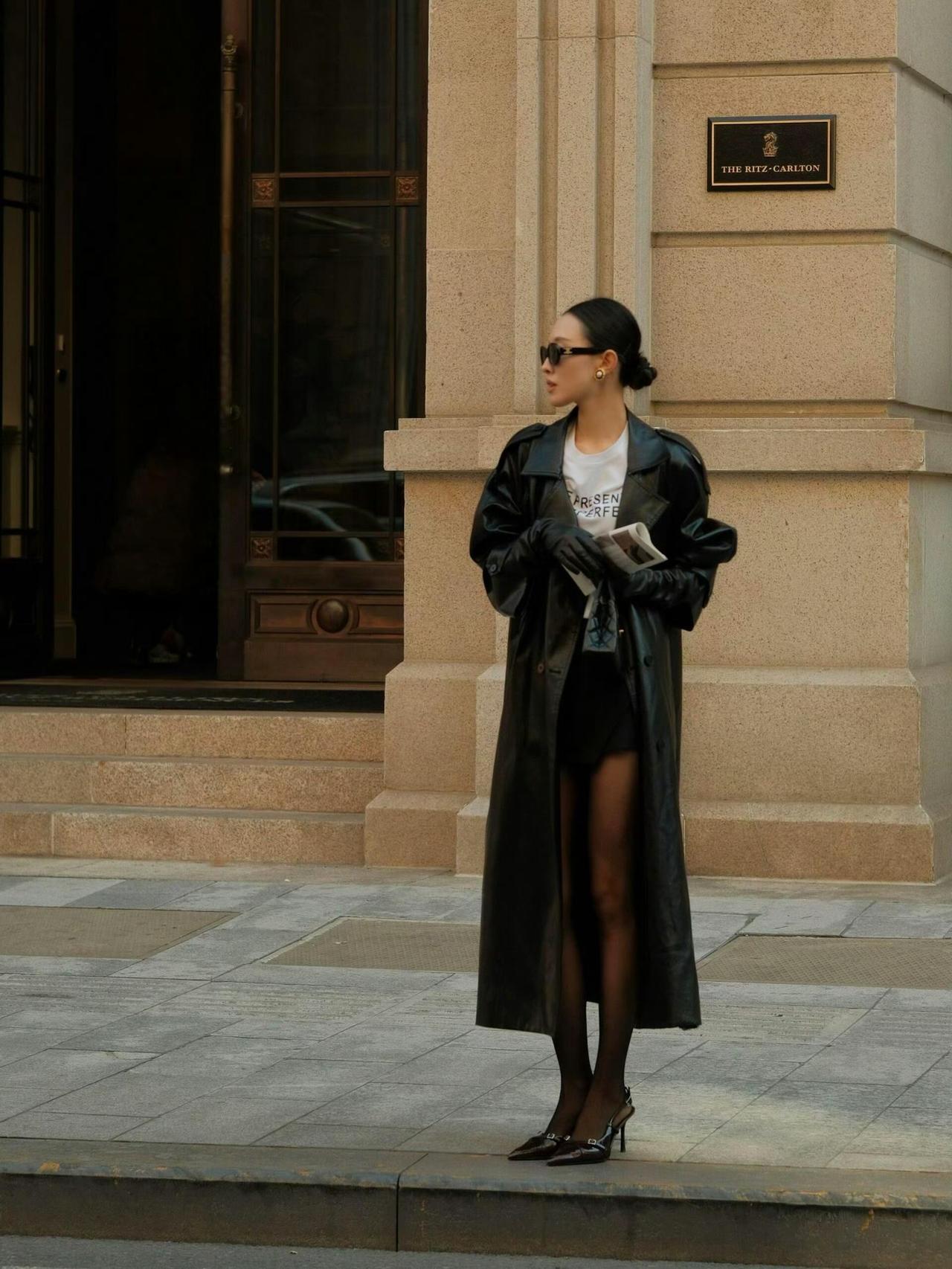 这套穿搭是酷飒高级的全黑皮质通勤风,松弛又带都市气场。黑色长款皮质风衣自带酷飒质感,宽松版型营造出慵懒通勤氛围;内搭白色印花T恤+黑色短裙,基础款中和了皮质的厚重,让造型更显轻盈利落。 搭配漆皮高跟鞋强化性感酷感,修饰腿部线条;黑色菱格包精致高级,与风衣风格呼应;手套+报纸道具增添了复古都市细节,让气场更具张力。能充分展现穿着者酷飒高级的都市魅力。轻奢风女风衣 御姐风衣穿搭 黑色皮风衣
