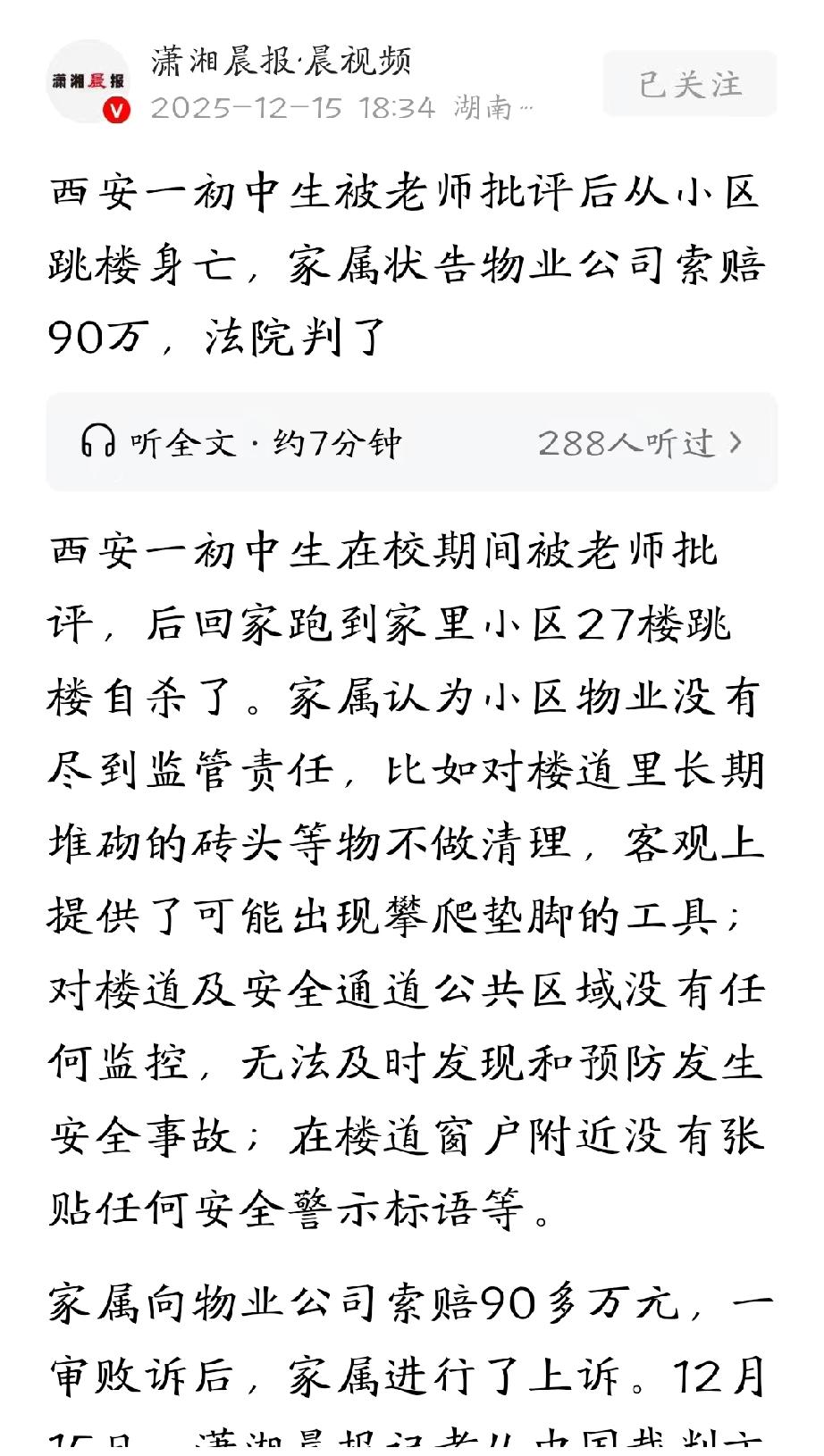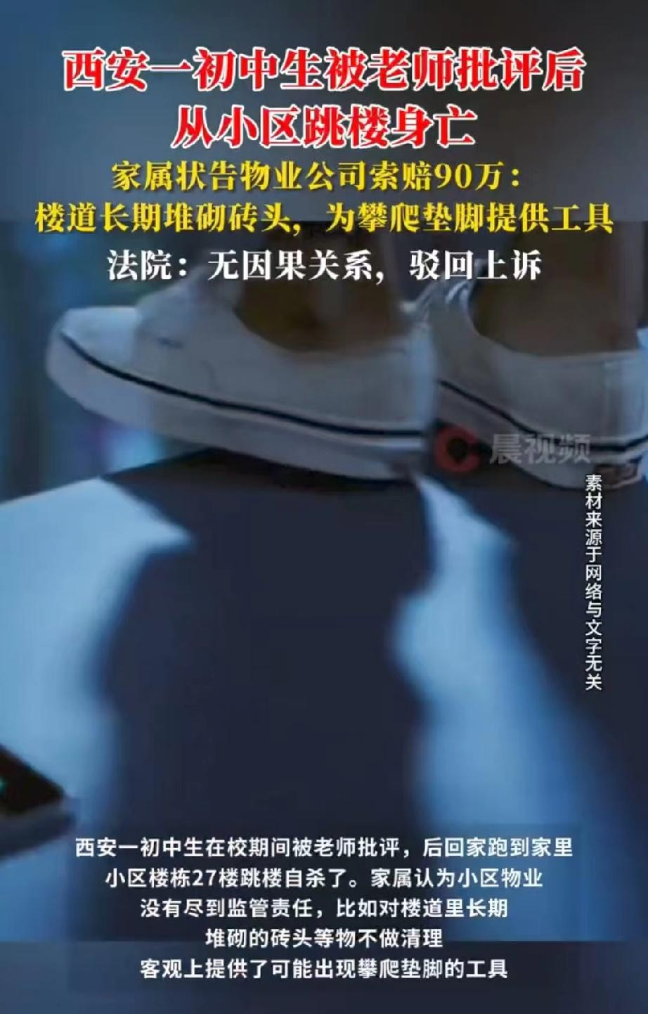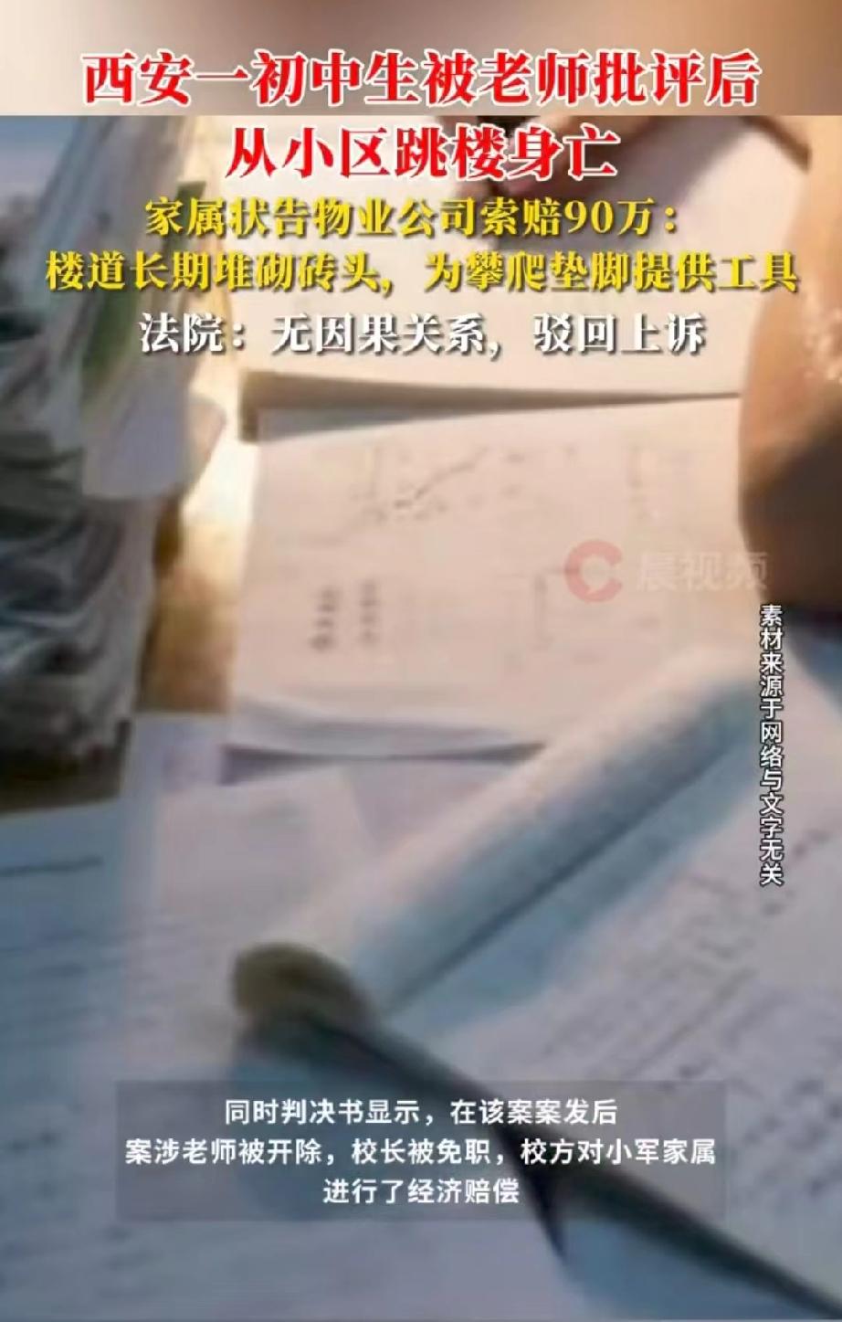陕西西安,初一男生在学校玩手机被老师批评,情绪低落,放学后跑到自家小区27楼,跳楼自杀。随后,涉事老师被辞退,学校也给了家属相应的赔偿,但家属还不满意,他们认为,楼道里有4块砖,成了孩子攀爬垫脚的工具,楼道也没有任何警示标语或者监控,所以,小区物业也没有尽到监管责任,便将物业公司告上法庭,索赔90多万。法院的判决亮了。 小军是一名初一的学生,为了让他上学方便些,父母特意在学校附近租了套房子,可是,可一场悲剧,打破了这份平静。 2023年12月7日晚上七点多,天已经黑投,小军却还没有回家,这太不正常了。 父母赶忙和老师联系,老师说学校早就放学了,一家人更着急,到处找寻,可找了好久都不见孩子踪影,无奈之下,选择报警。 就在大家急得焦头烂额时,小区物管人员在单元门口右侧竟发现了小军的尸体。 警方很快赶到现场,调取了电梯内监控,画面显示,小军放学后推着自行车进了电梯,直接坐到了27层,之后从27层楼道的窗户坠落,不幸死亡。 好好的一个孩子,说没就没了,父母接受不了。而且,他们家在5楼,孩子为什么要去27楼呢? 为了解开疑团,小军父母赶紧和学校联系,这才得知,当天小军在课堂上看课外书、玩手机,被老师批评了。 小军心里憋了一肚子怨气,情绪特别低落,这才想不开,走了极端的一步。 得知真相后,小军父母又气又痛。学校很快对此事也做出了处理,批评小军的老师被开除了,校长也被免职,学校还对小军的死亡进行了赔偿。 可小军家属觉得,这事儿不能只怪学校,小区物业对小军的死亡也得负安全监管责任。 他们发现,27层楼道放着四块砖块,觉得这四块砖块给小军跳楼提供了垫脚的支撑,有直接因果关系。 于是,小军家属一纸诉状将物业公司告上了法庭,要求物业公司支付死亡赔偿金894260元、精神损失赔偿金5万元,还要承担诉讼费。 从法律角度来看,物业公司到底有没有尽到管理责任,该不该对小军的死亡承担赔偿责任呢? 法院经过调查审理,查明事发当天,小军在学校被老师批评后,回家乘坐电梯,他没在自家的5层下,而是直接坐到了顶层27层,然后坠楼身亡。 小军虽然未成年,但已经满十二周岁,有一定的辨别能力,对于自己行为可能造成的后果,已经有些认知。 对于那四块砖块,物业公司表示,这砖块是业主放置的,他们经常清理,可清理完没多久,又有人堆放。 物业公司觉得,楼道堆放砖块的行为,和小军的死没有直接因果关系,所以小军家属要求他们承担责任,没有法律依据。 所以,一审法院驳回了小军家属的诉讼请求。 对此结果,小军家属无法接受,再次提起上诉。 二审法庭上,小军家属坚持认为,物业公司没有对安全通道的窗户采取任何安全防护措施,在楼道窗户旁也没张贴安全警示标语。 楼道里长期堆砌的砖头等,也没有及时清理,给小军提供了攀爬垫脚的工具。此外,楼道内没有任何监控,没办法及时发现事故。 所以,物业方存在过错,应对小军的死亡承担赔偿责任。 《民法典》第1198条规定:公共场所的经营者、管理者未尽到安全保障义务造成他人损害的,应承担侵权责任,其归责原则为过错原则。 本案中,物业公司对楼道砖块存在反复清理的行为,已尽到合理管理义务;而楼道窗户并非高危特殊区域,法律未强制要求额外加装防护设施,无警示标语也不等于未尽义务。 小军坠亡的核心原因是自身自杀行为,砖块和无警示标语并非导致其死亡的直接诱因,物业不存在违反安全保障义务的过错。 而且,《民法典》第19条明确规定:八周岁以上的未成年人为限制民事行为能力人,实施民事法律行为需法定代理人代理或同意,但对跳楼这类危及生命的行为具备基本认知能力。 小军已满12周岁,理应清楚从27楼坠落会导致死亡的严重后果,其自主选择跳楼是死亡的直接、根本原因。 小军自杀属于突发且主观故意的极端行为,远超物业日常治安防范的合理范畴。 物业既无法预判此类行为,也无能力实时阻止,其已尽到该法条规定的基本管理和防范义务,不存在失职,所以无需担责。 最终,法院驳回了小军家属的上诉,维持了原判。