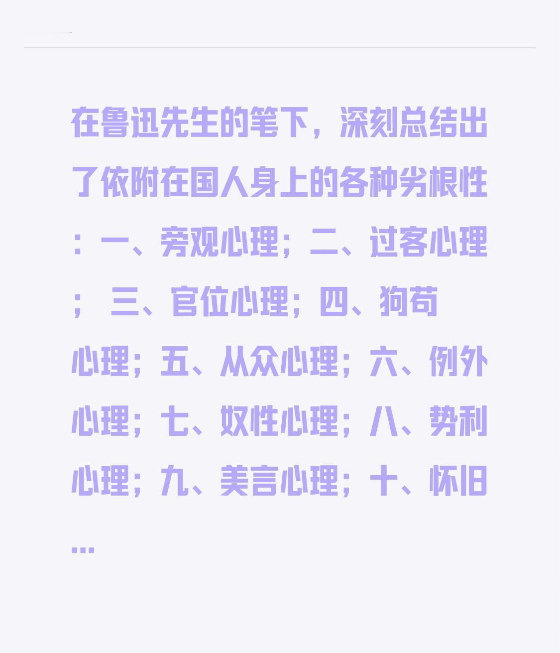 在鲁迅先生的笔下,深刻总结出了依附在国人身上的各种劣根性:一、旁观心理;二、过客