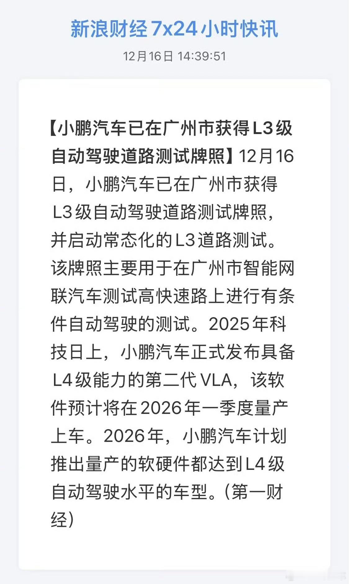 小鹏汽车已在广州市获得L3级自动驾驶道路测试牌照小鹏也将启动常态化的L3道路测试