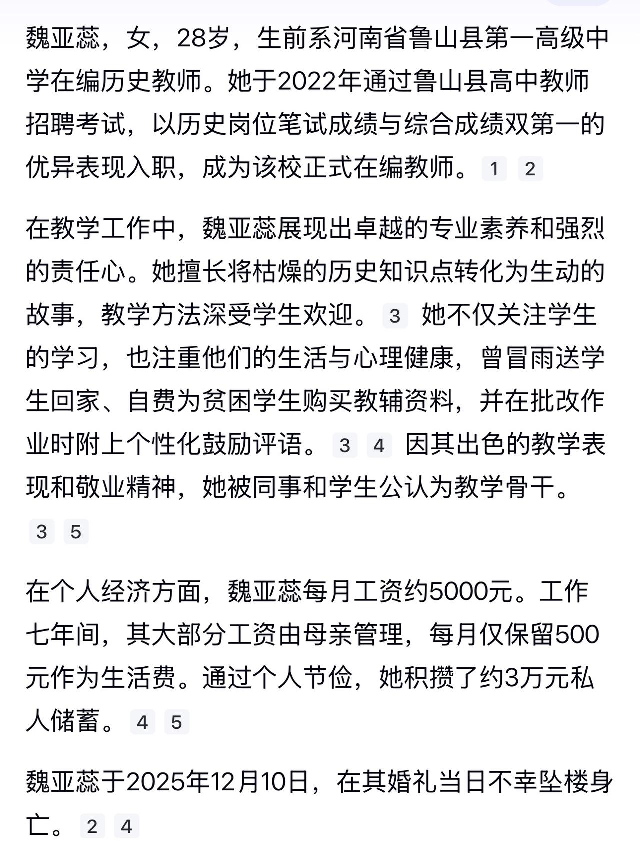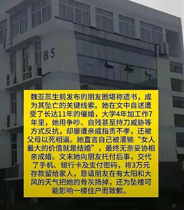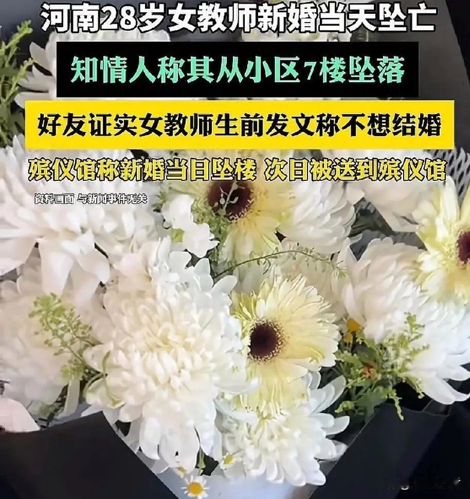 看了令人痛心(转) (转者注:在魏亚蕊的教案里,有一行被划掉的字:“教育是帮人看见牢笼,并找到钥匙。”一一可是,作为教师的她,最终却没能给自己找到这把钥匙) 这起悲剧的核心是28岁的河南鲁山县高中历史教师魏亚蕊,因长达11年的被逼婚压力,在2025年12月10日新婚当天从7楼婚房跳楼身亡。具体细节如下: 一、人物背景与11年的逼婚抗争 1. 个人情况:魏亚蕊1997年出生,2022年以鲁山县高中历史岗位笔试、综合成绩双第一的成绩考入编制,是学生眼中“善良又漂亮”的好老师,课堂上她会耐心引导学生,还会自掏腰包帮助贫困生。 2. 逼婚起点:从17岁上大学开始,父母就开始催婚,工作后催婚变本加厉——母亲按月截留她的工资,仅留500元生活费,美其名曰“攒嫁妆”,实则计划用她的彩礼给弟弟置办婚事。 3. 反抗与妥协:她试过争吵、哭闹甚至以死相逼,却被父母以“不孝”道德绑架,亲戚也纷纷指责她“不懂事”。2025年3月她确诊抑郁症,父母却认为是“想太多”,藏起她的药换成“安神茶”,坚信“结了婚就好了”。最终她被迫接受父母安排的相亲,与仅见面三次的男方张某敲定婚事。 二、婚礼当天的悲剧经过 1. 婚前的绝望:拍婚纱照时,魏亚蕊眼神空洞、表情僵硬,新郎则全程低头玩手机,她曾跟朋友说“照片里的自己像戴了面具”。婚礼前一晚,她给朋友发消息:“这不是我要的生活,可我没力气反抗了”。 2. 坠楼瞬间:2025年12月10日上午9时许,接亲队伍还未抵达,身着婚纱的魏亚蕊趁亲友忙碌,从7楼婚房阳台纵身跳下,落在一楼住户刚装修好的院子里,当场失去生命体征。 3. 遗言与遗愿:她在朋友圈留下300字遗言,直言“在父母眼里我最大的价值就是结婚,11年的对抗我失败了”,并拜托朋友“找个有太阳和大风的日子,把我的骨灰扬了”,生前未能拥有的自由,她想在死后获得。 三、事发后的争议与官方澄清 1. 遗体搁置的真相:网传“娘家以‘嫁出去的女儿泼出去的水’、婆家以‘未正式过门’为由,双方均不肯收尸”,但当地村干部澄清,魏亚蕊家境优渥,不存在彩礼纠纷,父母是因痛失爱女悲痛欲绝,迟迟不愿接受女儿离世的事实,并非“不收尸”。其遗体最终在12月11日被鲁山县殡仪馆接收。 2. 官方定性:警方现场勘察后排除他杀可能,认定为自主高空坠亡,校方已联动教育部门开展师生心理疏导,当地民政部门也表示将针对婚俗陋习加强调研引导。 新娘结婚当天从7楼跳楼身亡 建议关注教师心理健康问题 鲁山魏亚蕊 河南女教师坠楼 鲁山教师坠楼 魏亚蕊