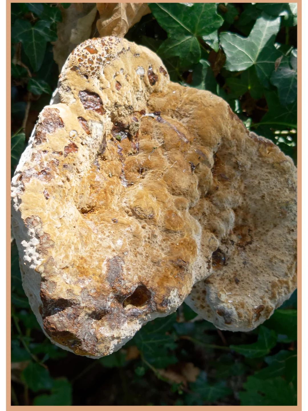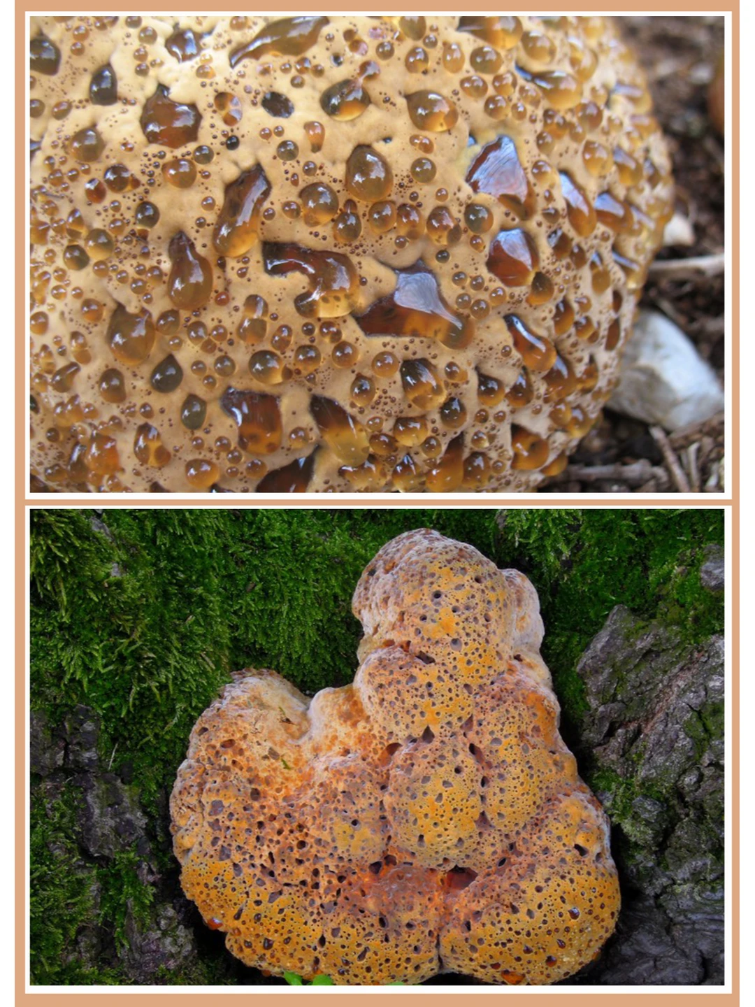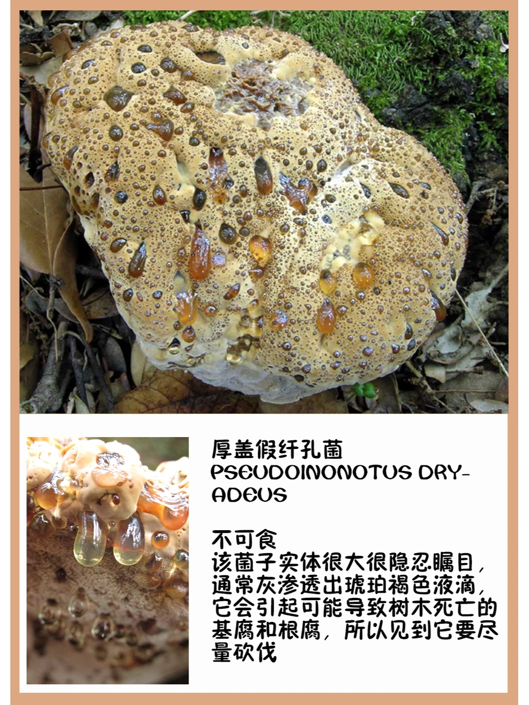 厚盖假纤孔菌 pseudoinonotus dryadeus 不可食 该菌子实体很大很隐忍瞩目,通常灰渗透出琥珀褐色液滴,它会引起可能导致树木死亡的基腐和根腐,所以见到它要尽量砍伐