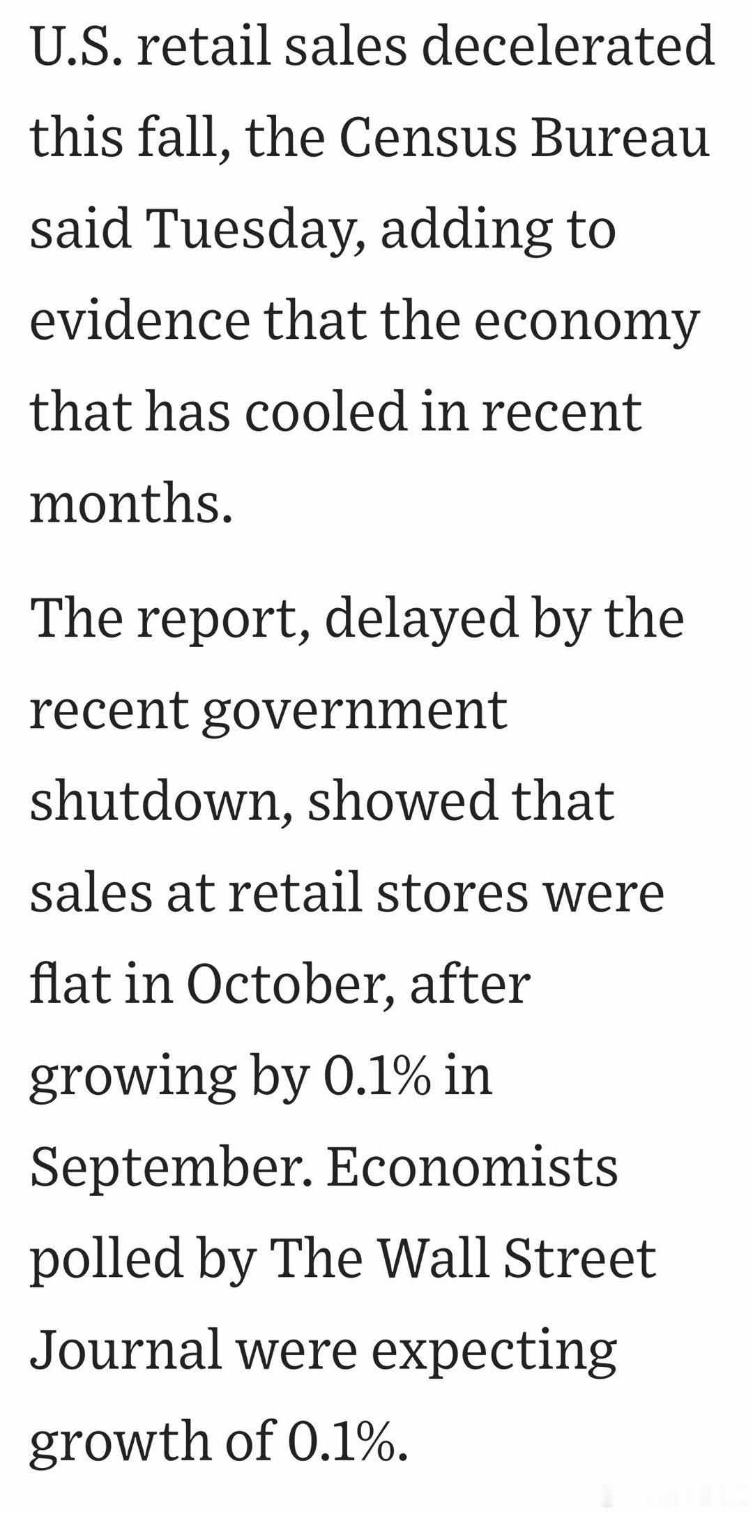 十月零售,没有增长,低于预期九月只增长0.1%,远低于去年平均月增0.5%低端业务好:Walmart、GAP、TJ Maxx等买食物在选小包装、买日用品在降级到非名牌消费状况继续恶化