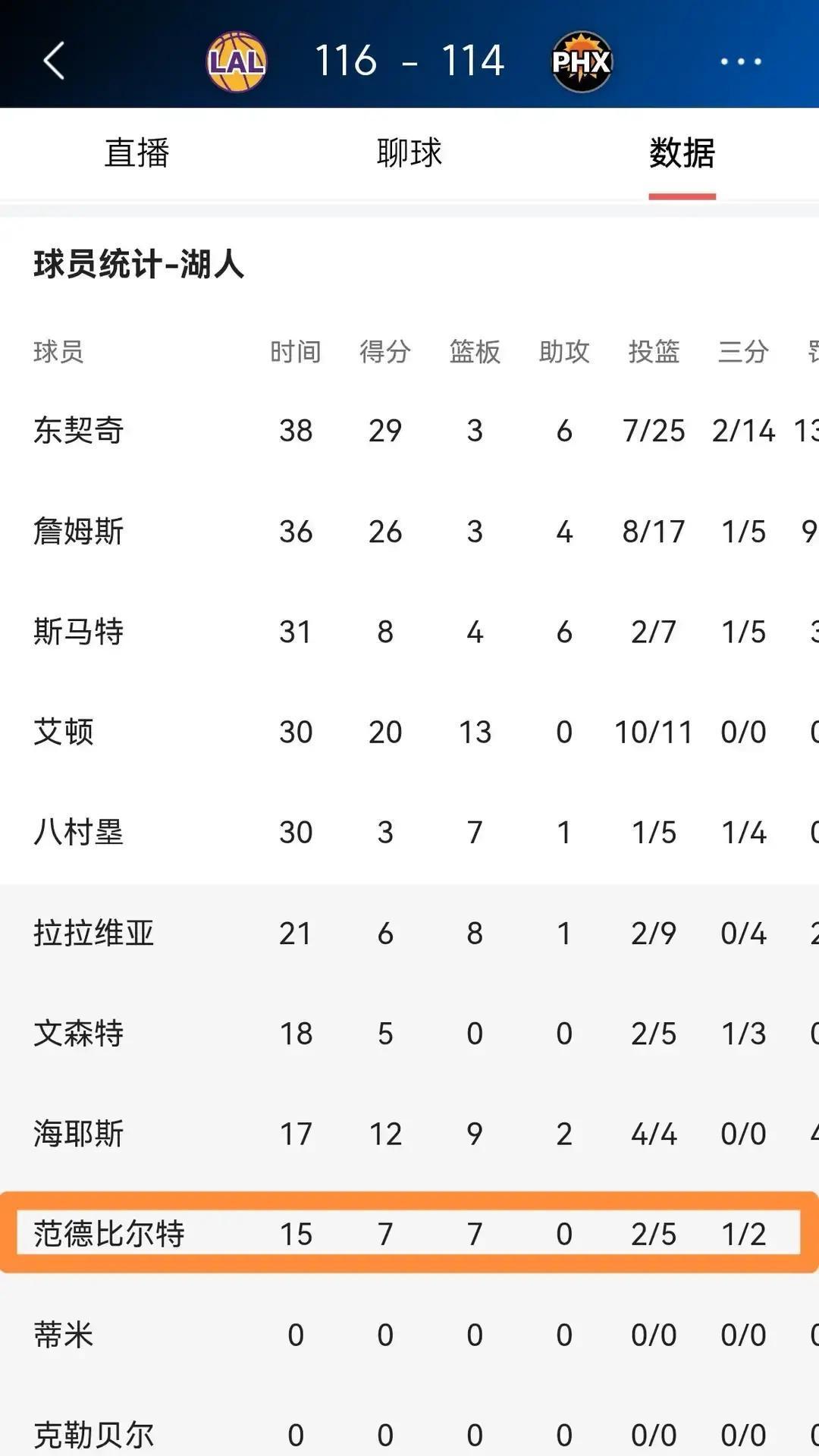 范德比尔特回来了。缺了五十三场,一回来就玩命。 打太阳这场,他就上了十七分钟。数据乍看不起眼,六分,四个篮板其中三个是前场板,还有两次抢断。但正负值全队第二,防得对位的人命中率才三成多。这就是价值。 湖人太需要这么个人了。能抢,能防,满场飞。浓眉赛后都说了,他的活力点着了全队。这话不假,那几个前场篮板,都是实打实的士气球。 伤了这么久,复出首秀这劲头,说明他珍惜机会。自己想证明,球队也真给机会。主教练哈姆说了,后面会慢慢给他加时间,可能还要提上首发。为什么?因为湖人锋线上缺这么一块拼图,缺这种不要命的防守能量。 但话说回来,一场比赛不能说明全部。他进攻端的手段还是少了点。未来想站稳脚跟,光靠防守和篮板还不够,空切和那手三分得练得更稳。 总之,回来是好事。湖人这防守,多一个能撕咬的,季后赛的路就多一分底气。看他能保持多久吧。