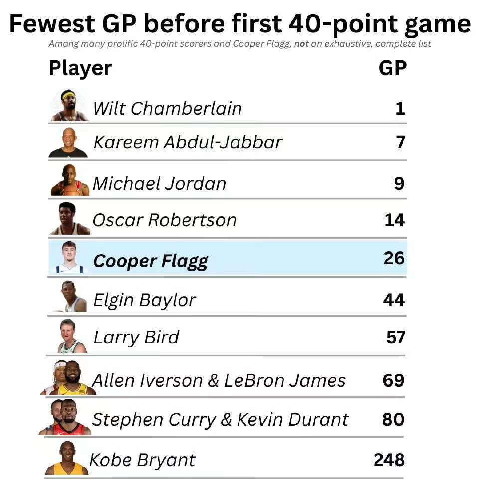 就在刚刚不久前,2025年的状元弗拉格,在对阵爵士的比赛中,得到了42分6篮板7助攻,那大家知道NBA联盟历史上,众多巨星第一次得到40分都用了多少场吗?最近就有媒体给出了统计: 科比-布莱恩特:248场 库里和杜兰特:80场 艾佛森和詹姆斯:69场 “大鸟”拉里伯德:57场 埃尔金贝勒:44场 库博弗拉格:26场 大O罗伯特森:14场 迈克尔乔丹:9场 天沟贾巴尔:7场 维尔特-张伯伦:NBA生涯第一场比赛,就达到这个成就,他的第一场比赛,是代表费城勇士队对战纽约尼克斯队,最终得到43分28个篮板!