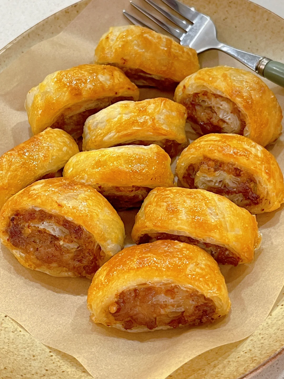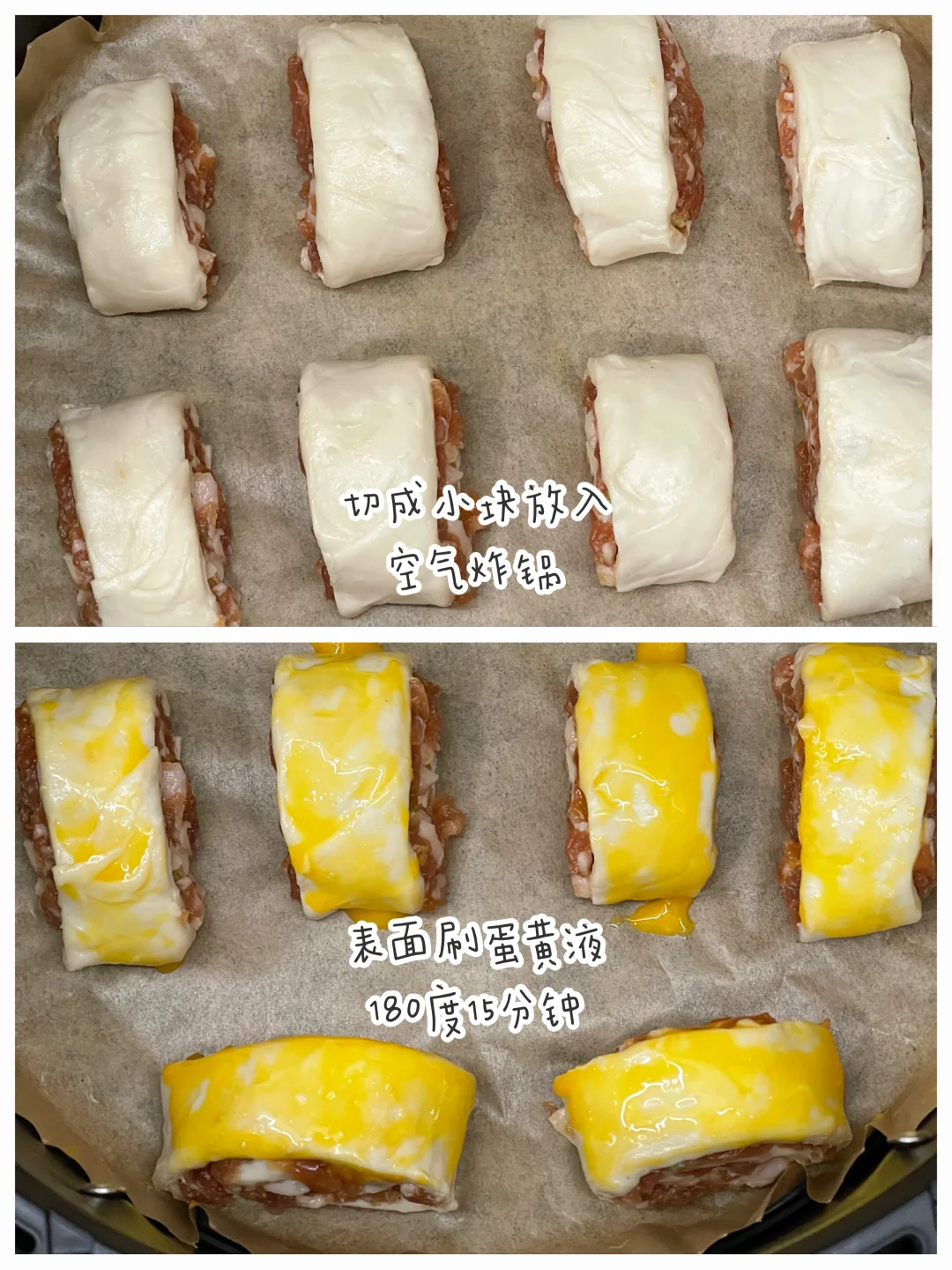 手抓饼的花样吃法再加一个,铺上肉馅儿卷一卷烤一烤就能变成肉花卷,酥酥脆脆的真的香,大人小孩都爱吃,宝宝吃手抓饼换成黄油版的就可以~ ✅准备食材:手抓饼、肉馅儿、蛋黄。 ✅制作方法: 🔹肉馅儿加入适量葱花,2勺生抽、1勺蚝油、适量的胡椒粉顺时针搅拌均匀。 🔹把调好的肉馅儿均匀的铺在手抓饼上,卷成卷,切成均等大小. 🔹放入空气炸锅,表面涂上蛋黄液,180度15分钟即可。