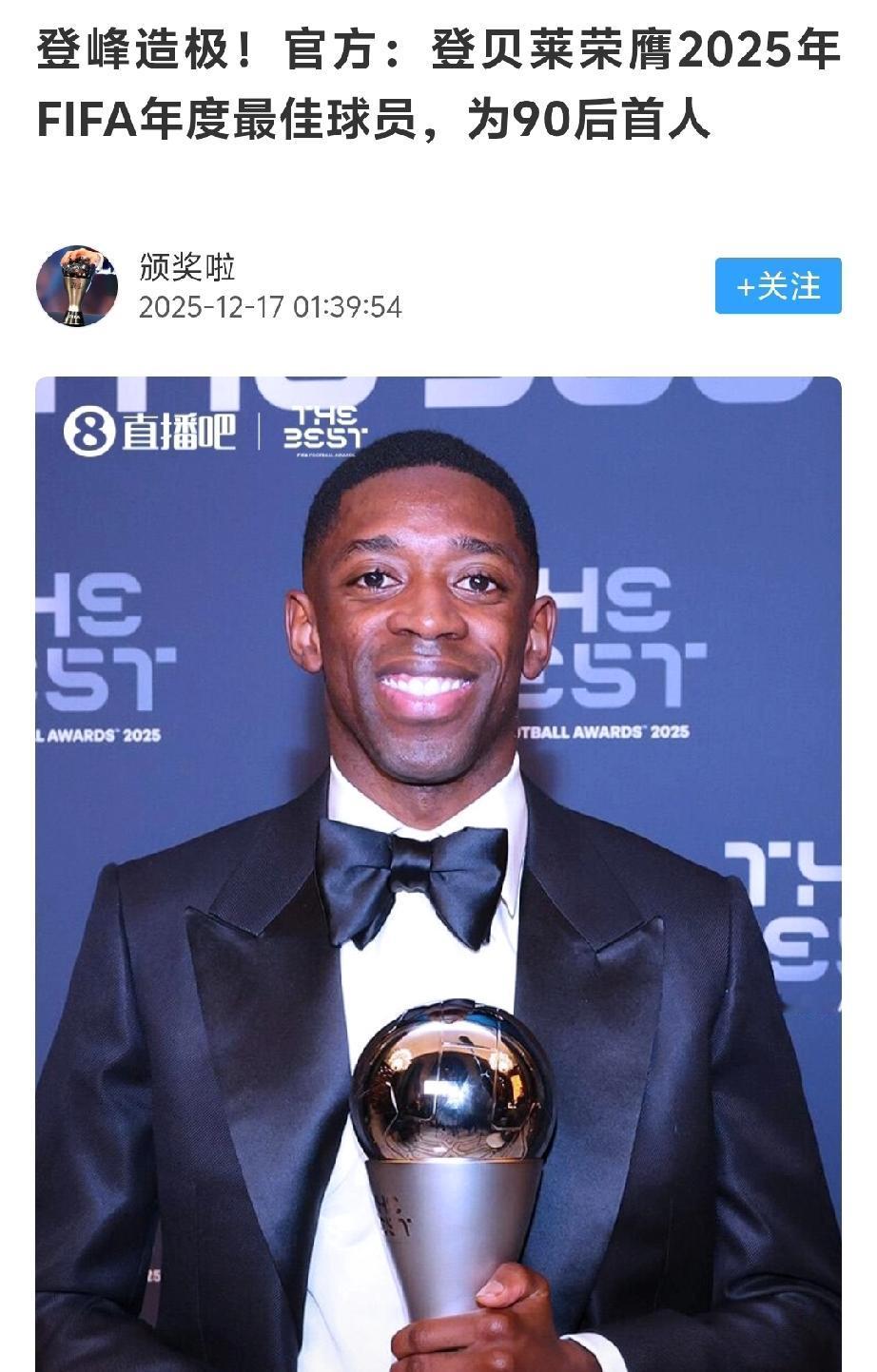 过去一个赛季登贝莱的确配得上世界足球先生的称号,毕竟姆巴佩、梅西等都在的时候大巴黎也没拿过欧冠冠军! 但是令人吃惊的是登贝莱竟然是90后目前唯一的足球先生,看来90后真的人才断档了,00后亚马尔、威尼修斯等才是未来欧洲金球奖、世界足球先生有利争夺者!