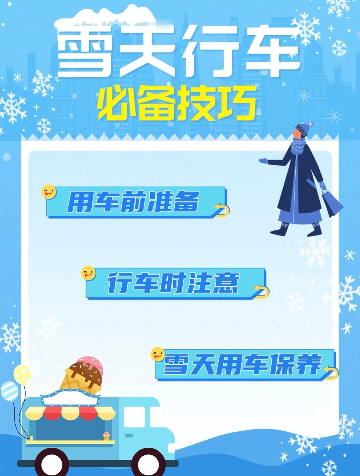 掌握这些冰雪路面小技巧❄️让出行更安全😉!行车前准备1️⃣行车前务必清除车辆的前后风窗玻璃、灯罩和后视镜上的霜雪,以及鞋底的积雪❄️,避免在踩制动踏板时发生滑动。2️⃣在雪天,不要使用蛮力强行打开被冻住的门把手,否则容易出现门把手或门锁损坏等情况。❗️❗️Tips:可以使用除冰剂给门把手解冻和后视镜除霜哦3️⃣雪天行车前,应检查并更换雪地胎🛞,以增强轮胎在冰雪路面上的抓地力,提高行车安全。4️⃣在积雪较深或结冰路段,应为车辆安装雪地链,并在通过冰雪🧊路面后及时拆除,以免对轮胎和路面造成损害。行车时注意⚠️降雪会导致地面积雪结冰或者道路泥泞,使得轮胎的抓地力下降,因此雪天行车时应降低车速,适当增加和前车的距离。1️⃣起步或加速时,要轻踩电门,平稳起步,避免打滑和侧滑。2️⃣转向时,先减速或轻点几次刹车,提醒后方车辆减速,同时慢打方向盘,避免追尾。3️⃣尽量选择有车辙的路线,使车轮更好地抓地,减少打滑风险。雪天用车保养1️⃣定期清洗底盘,避免雪水腐蚀2️⃣停放时,将雨刮器抬起,避免雨刮器和前挡风玻璃冻在一起3️⃣为车辆🚙罩上加棉的车衣,不仅保暖还容易清理积雪4️⃣停车后可在门缝处抹上润滑油,能有效防止车门被冻住。5️⃣尽量将车辆停在室内停车场🅿️,避免停在大树下、棚户等地方,以免积雪压塌我与汽车的日常大v聊车