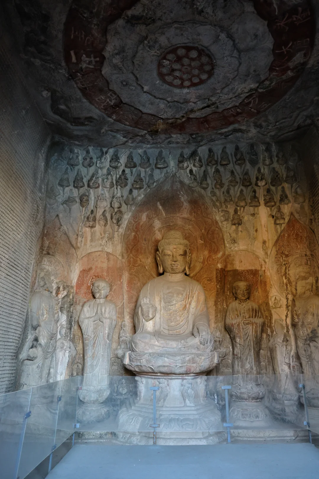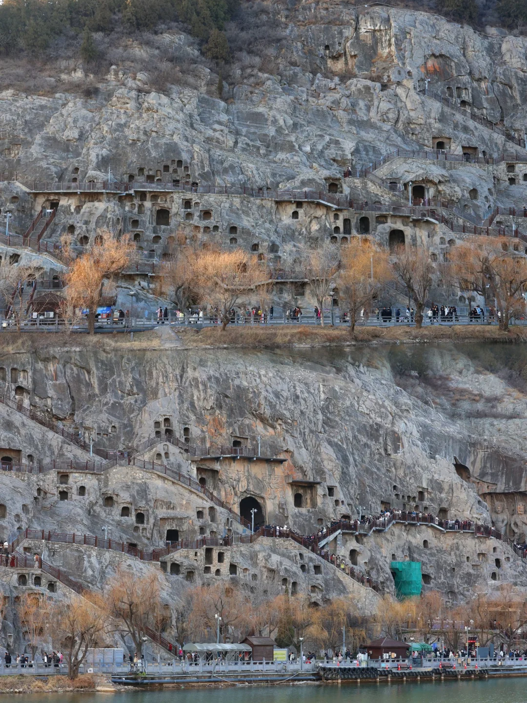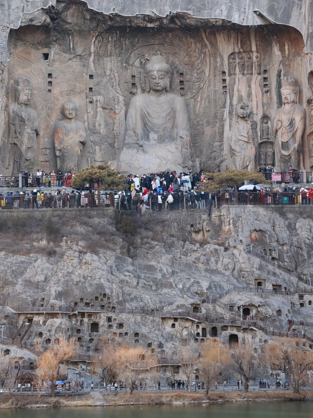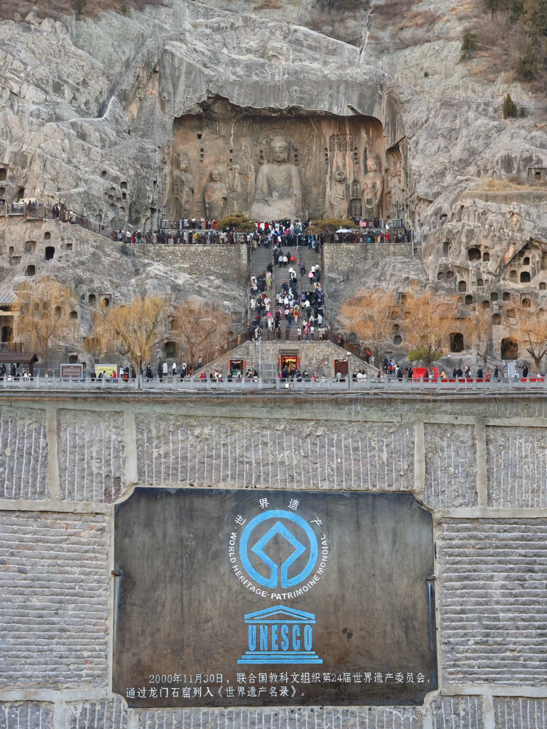 💕去河南旅游,少林寺和龙门石窟可以一条线路,上午去少林寺,下午去龙门石窟了。河西的龙门山与东岸的香山对峙如天然门阙——隋炀帝在此望见“伊阙”,龙门之名由此而生。 💗沿西山栈道向上,潜溪寺的唐代佛像还带着北魏的清癯。宾阳北洞的“剪刀手”佛像食指中指微张,像是要夹住一缕偶然闯入的光——或许是唐代工匠未竟之作,却在无意中定格成独特姿态。 👀👀💕💕但龙门的魂魄,在奉先寺。那里不是洞窟,是整面山崖被劈开雕琢的佛国。踏上石阶回望的瞬间,卢舍那大佛以十七米的身躯完整地占据天空。她丰润的脸庞低垂,眼帘微阖,嘴角留着知晓一切后的浅笑。不同角度看,都觉得她在看你——看穿皮囊之下那个渺小的存在。史载武则天捐出两万贯脂粉钱开凿此像。她的名字“武曌”寓意日月当空,恰如卢舍那“光明普照”之意。权力顶峰的孤独,或许需要神佛的注视来安抚。只是佛光慈悲,人间的光难免投下阴影。 😭😭这里许多佛像已失去头颅。在古阳洞,有一尊菩萨只剩纤长脖颈,衣纹流动的身姿成了无言的问号。二十世纪初的斧凿声曾在峡谷间日夜响起——佛依旧垂目,看着自己的肢体被运下山,顺着河水漂向未知的远方。 🚗 行程建议: 🕐 时间: 一定要下午去!🕒 阳光斜照在佛像上的光影绝美,我大概2点进去,5点出来,时间刚好,听说夜景更好看,不过跟旅行团,没办法逗留了。 🪡路线: 主要造像都在西山,建议把大部分时间和精力放在这边。东山可以眺望西山全景,路线是从西山走往东山回去。 👀必看: 💗奉先寺卢舍那大佛: 毋庸置疑的C位!🤩,感觉整片天空都是她的背景板。 💗宾阳三洞(北洞): 打卡超有名的“剪刀手”佛像✌️,其实是唐代未完工的遗迹,有种穿越千年的俏皮。 💗古阳洞: 看北魏到唐的风格演变,衣纹和神态的细节太美了。 💗东山看全景: 过桥到东山,回头望,整个西山石窟群像一幅巨大的历史画卷在眼前展开,超级壮观! 📝小贴士: 👟1. 穿舒服的鞋! 一直在上下爬楼梯和坡道。 🎧2. 可以请讲解,或者租讲解器,不然真的就是看石头。背后的历史故事才是精华! 📷3. 节假日人很多,拍照很难,随便找机位,能拍就拍,拍不了也没办法回头的。