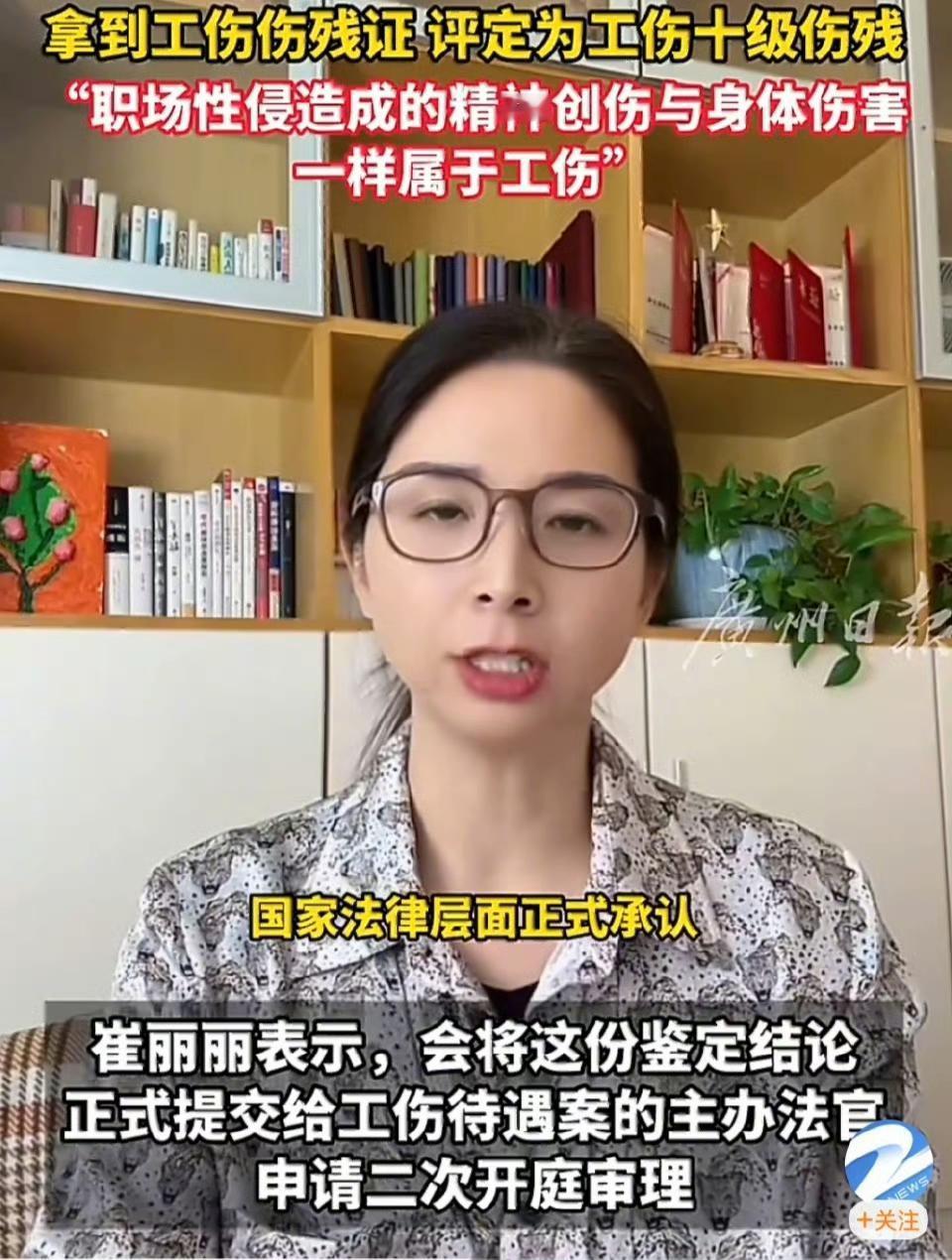 看到崔丽丽这个“十级”伤残的认定,虽然在等级上看似不高,但它背后的意义却重如千钧。这不仅仅是一张纸、一个等级,这是国家法律层面对她所遭受的看不见的精神创伤——PTSD(创伤后应激障碍)的正式“看见”和认可。 在此之前,职场性侵往往被视为一种单纯的刑事犯罪,受害者在事后不仅要承受巨大的心理痛苦,还要面对失业和经济来源断绝的困境。崔丽丽的坚持,打破了“工伤仅限物理伤害”的传统认知,让法律承认了精神伤害同样属于工伤范畴。这对于以后所有遭遇类似不幸的职场人来说,都是一条宝贵的维权路径和一剂强心针。 从2023年9月遭遇侵害,到如今2025年12月,两年多的时间,她一直在维权的道路上艰难跋涉。她不仅要对抗病痛,还要面对前公司的冷酷无情——在她最需要支持的时候,公司不仅没有伸出援手,反而以“旷工”为由将她开除,甚至在工伤认定上百般阻挠。这种“二次伤害”是常人难以想象的。但崔丽丽没有屈服,她整理了232页的举证材料,一步步从刑事追责走到工伤认定,再到如今的劳动能力鉴定。 这起案件也狠狠地打了那些“受害者有罪论”和冷漠旁观者的脸。它传递出一个明确的信号:职场绝不是施暴者的避风港,遭遇侵害不可耻,沉默和纵容才是帮凶。法律最终会站在正义的一方,为受害者撑腰。 希望崔丽丽接下来的劳动争议案审理能够顺利,让她拿到应得的赔偿,早日走出阴霾,回归正常生活。也希望这个“全国首例”能成为一个标杆,推动更多企业真正重视职场安全,杜绝权力压迫和畸形的酒桌文化。