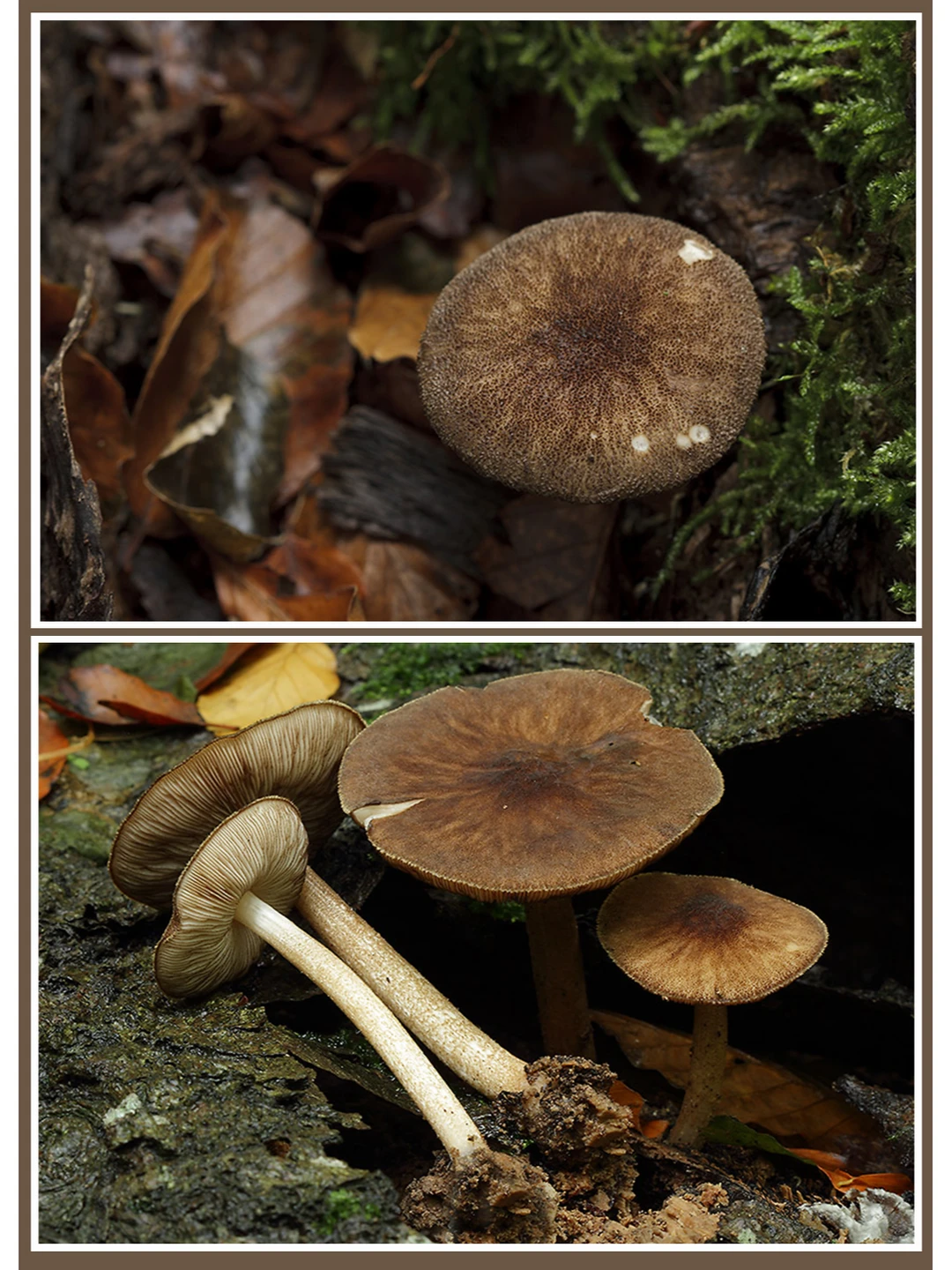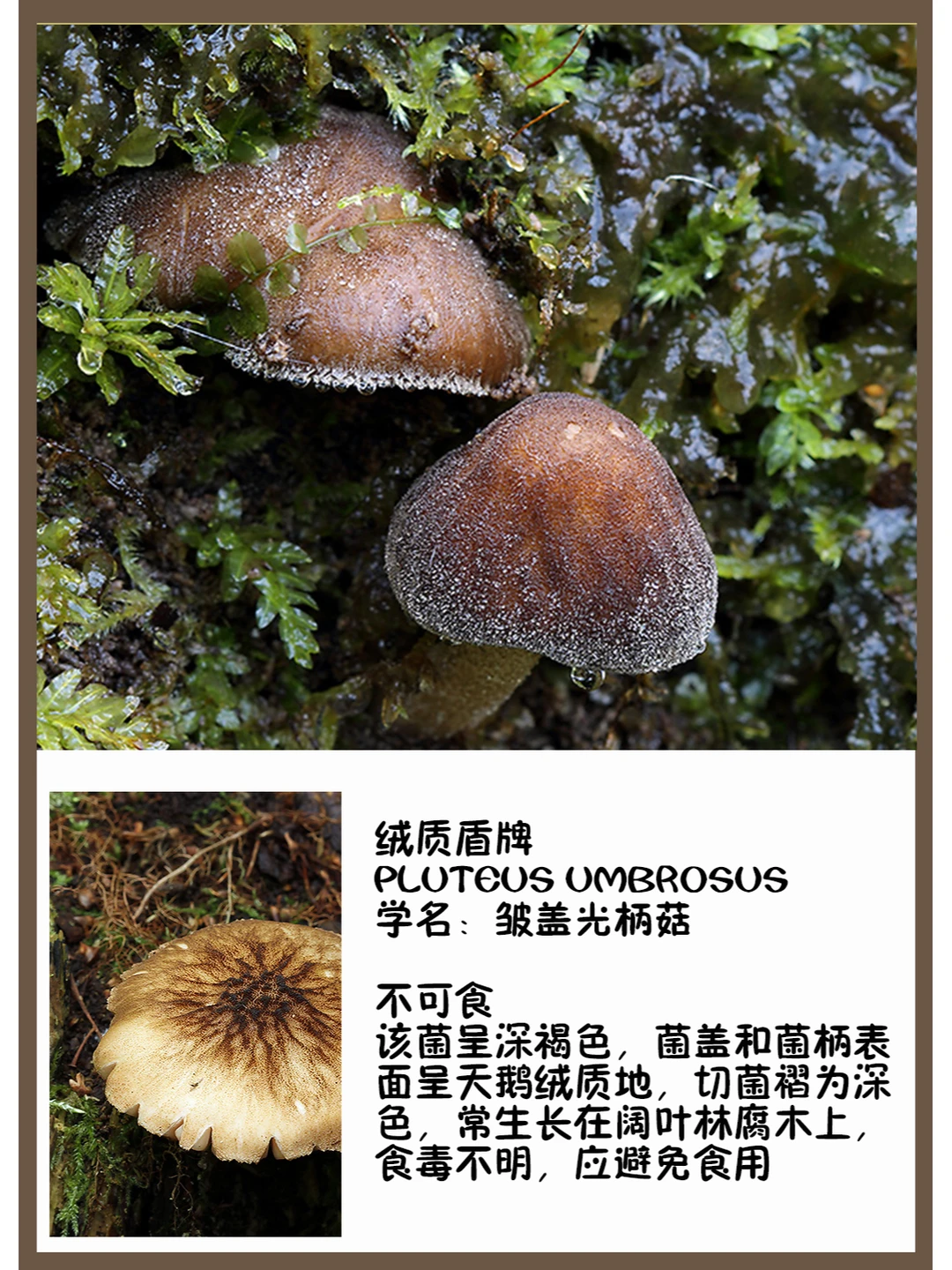 绒质盾牌 Pluteus umbrosus 学名:皱盖光柄菇 不可食 该菌呈深褐色,菌盖和菌柄表面呈天鹅绒质地,切菌褶为深色,常生长在阔叶林腐木上,食毒不明,应避免食用