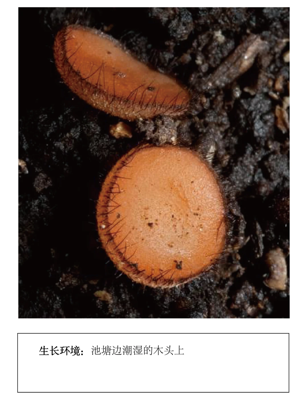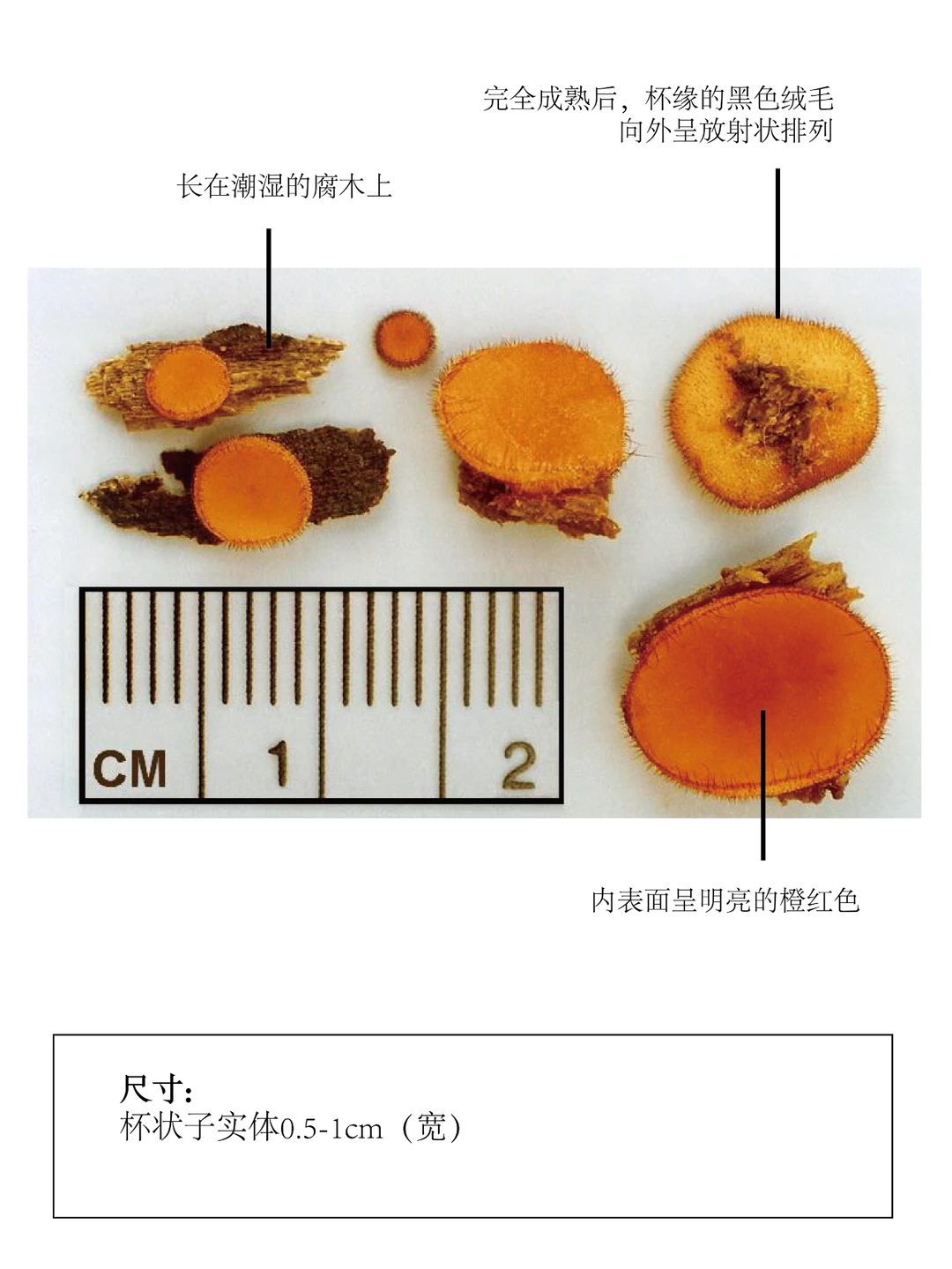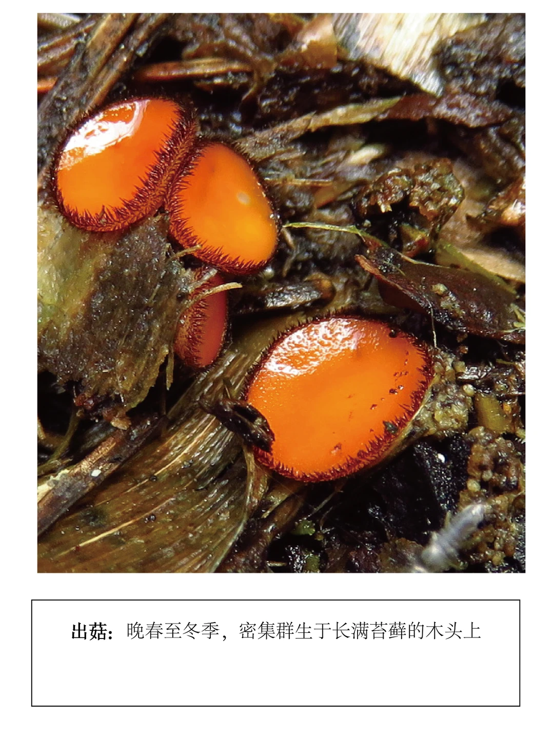 这种菌类的子实体非常小巧,直径大约在0.1-1.5厘米之间。它们的子囊盘扁平,形状像盾牌,颜色鲜艳,通常是鲜红色或桔红色。当干燥时,颜色会褪色。边缘有粟褐色的毛,这些毛在湿润时尤为明显。🌈