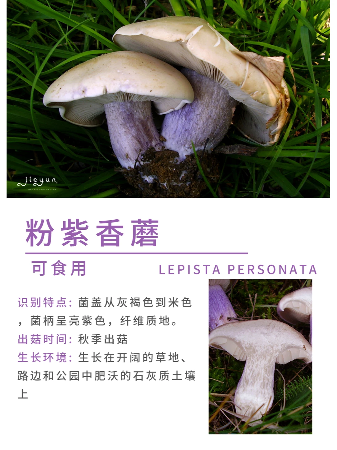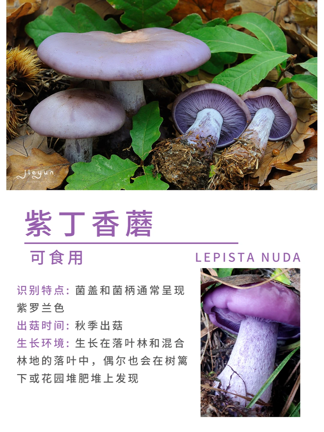 识别特点: 紫丁香蘑的菌盖和菌柄通常呈现紫罗兰色