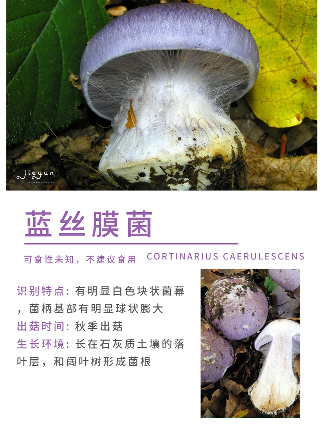 识别特点: 菌盖呈蓝色至蓝紫色,菌柄被纤丝。
