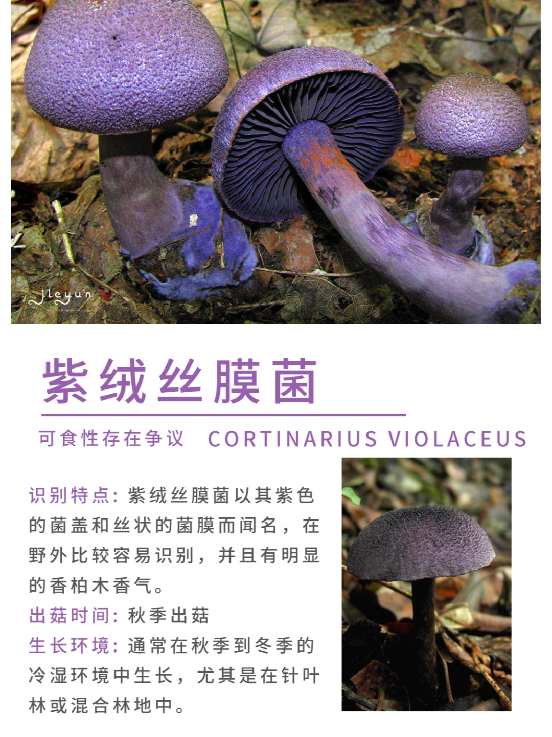 识别特点: 以其紫色的菌盖和丝状的菌膜而闻名,有明显的香柏木香气。