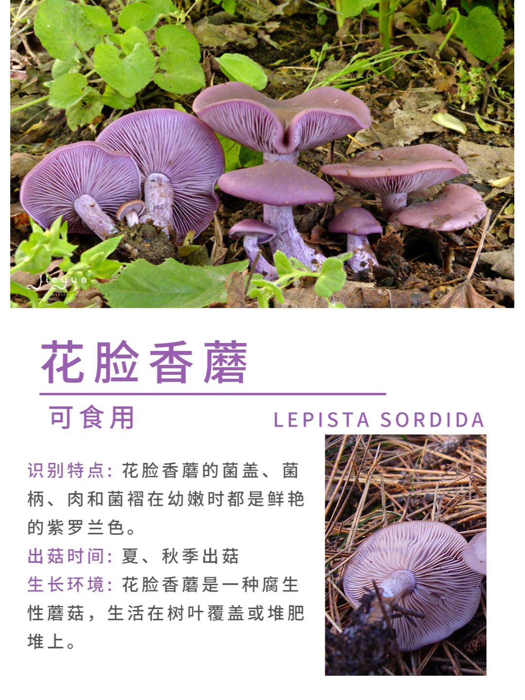 识别特点: 花脸香蘑的菌盖、菌柄、肉和菌褶在幼嫩时都是鲜艳的紫罗兰色。