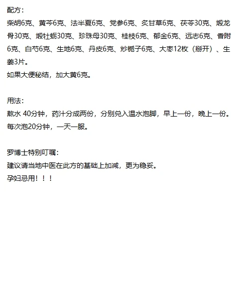 我在《女性养生三步走》书中曾经说过:女性90%的病都是憋出来的。 工作和生活的压力导致很多女性月干气不舒。 ⭐️⭐️我根据多年的经验,从张仲景的思路,慢慢摸索,不断调整,最终确定了一条加减的思路,命名为【解郁汤】。 ⭐️⭐️【解郁汤】能解决什么问题? 1️⃣月干气不舒 🎀用解郁汤泡脚,泡上一到两周,就能化解,各种不适都会减轻甚至消失。 ------------ 2️⃣ 睡不好💤 🎀如果确定是因为月干气不舒导致的睡不好,用解郁汤泡脚,要比吃💊更有用💤 ------------ 3️⃣ 生气所致高血压 🎀情绪变化导致了月干气不舒,月干气郁结,可用解郁汤泡脚! 注意要保证解郁汤是每天新鲜配制的,不可存放。 ------------ 4️⃣想要宝宝,要不上 🎀女性的排卵和月经,也与月干气的疏泄功能密切相关。 如果因为月干气不舒导致的想要小宝宝一直不能如愿,首先要做的事情就是疏月干里qi,这是解郁汤泡脚可以起到非常神奇的效果。 ------------ 5️⃣肝火犯肺 🎀月干气不舒会导致很多问题,其中一个就是肺部问题!不可忽视。 ------------- 6️⃣ 一滋补就上火 🎀很多女性身体出现不舒服,病恹恹的,就想到了滋补身体。但大多数情况是一滋补就上火,牙疼,嗓子疼,起痘都来了。 滋补补不进去,只能无奈放弃,身体越来越差。 为什么一滋补就上火呢?其中一个最主要的原因就是月干气不舒。