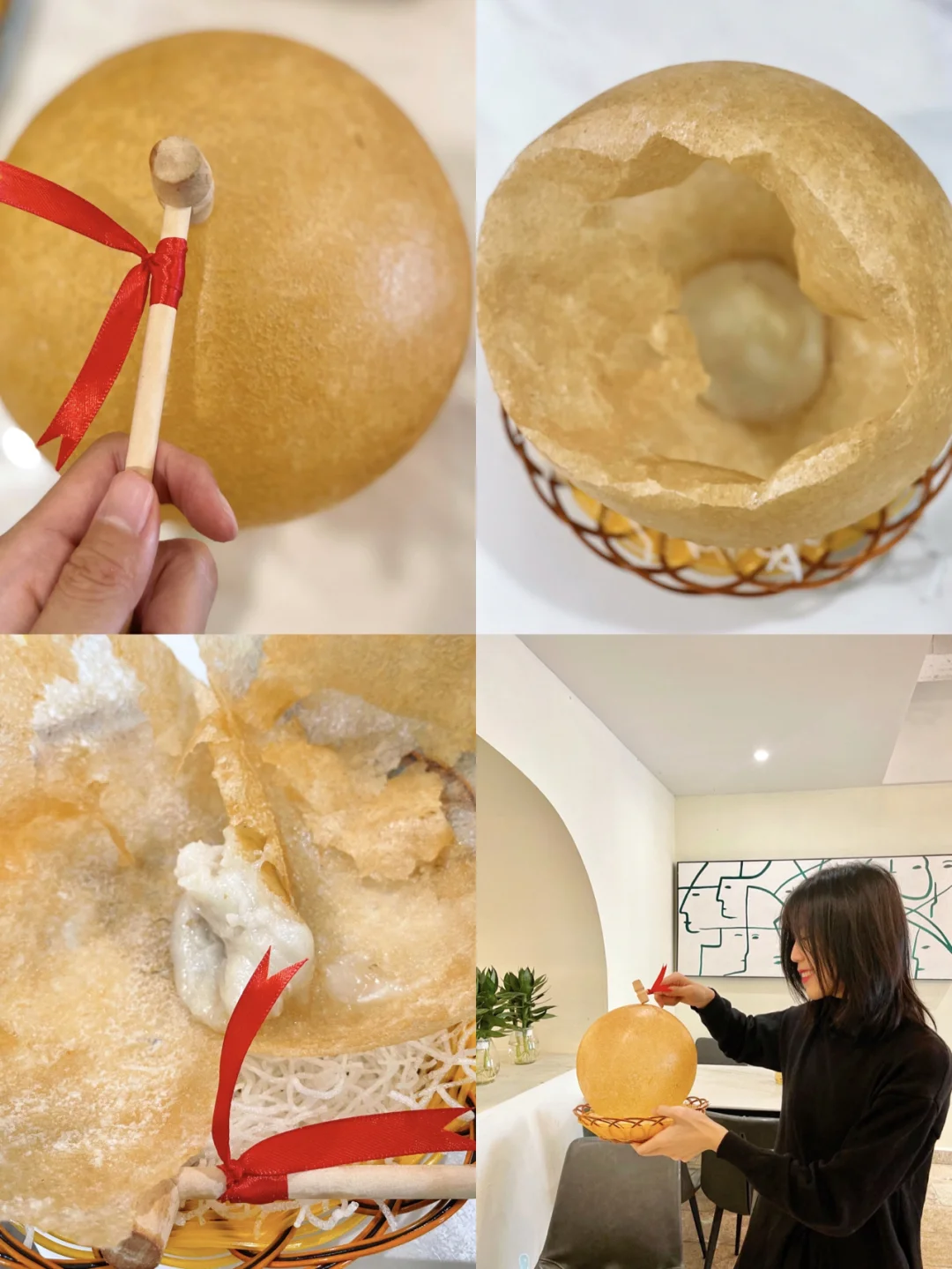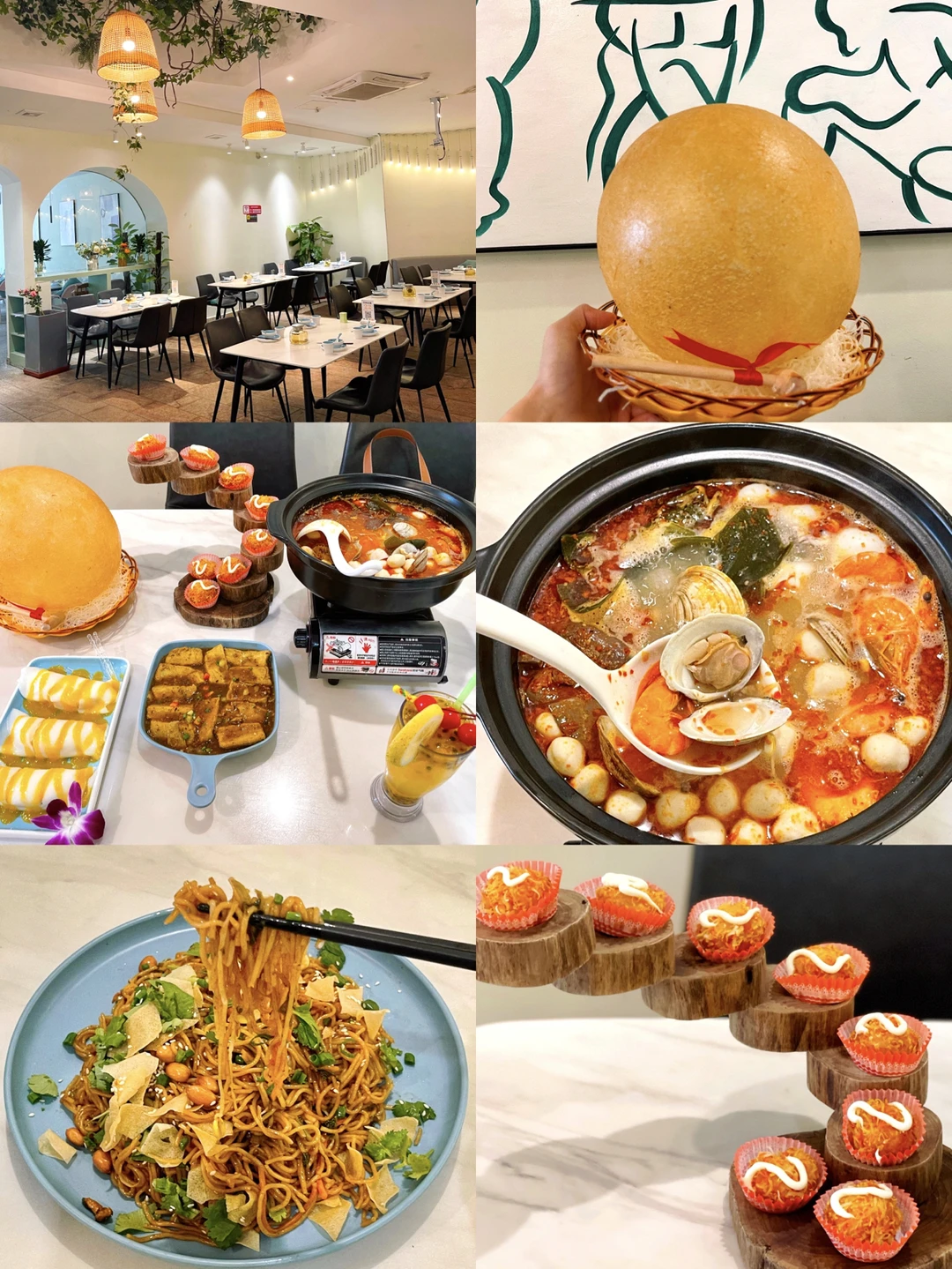 🗣下飞机第一顿就是直奔这里吃海南必吃的糟粕醋,这是琼乡阁餐厅的招牌菜,里面有猪血、虾、鱼丸、海带等不同的配料👄喝起来就是像冬阴功的酸甜口感,很暖胃舒服,✍🏻其他菜点了招牌海南粉、造型独特的步步高升虾、入口即融的阿婆手工豆腐,桂花芒果卷里面的芒果太香甜滑口了❤️比较特别的是比我的脸还大的金堆,拿一个小锤子敲开,敲开里面就是软糯糯米糍,撕下外皮沾糯米,吃起来焦脆香甜,太让我心水了。