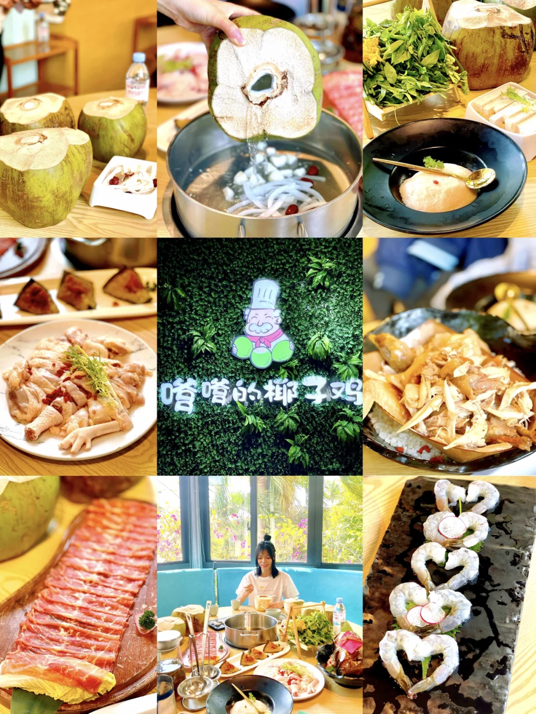 😆个人觉得是海南最好吃的椰子鸡,宋妍霏等明星网红都来打卡过餐厅😋3个椰子➕1个依云水➕新鲜的文昌鸡定时3分钟煮成我最爱的椰子鸡汤,喝起来甜滋滋的,沾上蒜蓉指天椒配方,鸡肉鲜嫩可口!🥰这次还点了很多新品,像千年古盐焗文昌鸡有被惊喜到,烧焦的外皮里撕开是白切鸡,盐焗的手法在最大程度上保留了鸡的嫩滑✔️还有口感嫩滑的牛肝菌、主食必点黑松露鸡油饭、Q弹可口的手打白胡椒猪肚丸、香煎黎家猪肉饼、外酥内脆的香煎黎家黑猪肉饼都值得点!