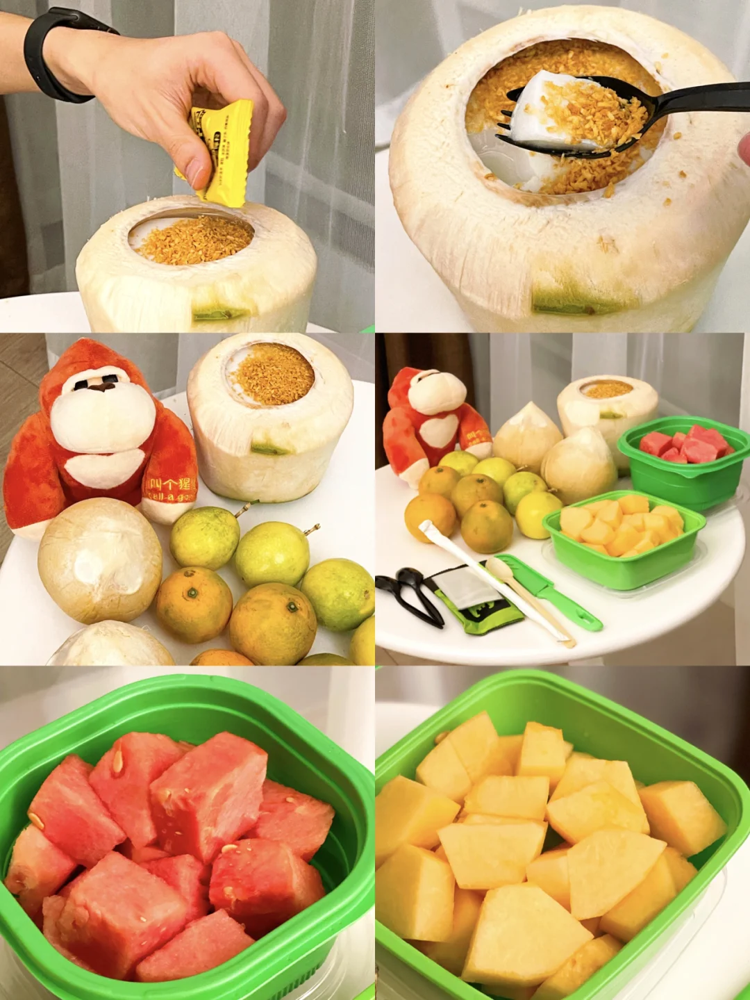 🏝海南的水果出了名好吃!我每次来三亚都很懒,都不想出门买水果,都是直接打电话给叫个猩猩水果,让他们直接配送到我住的酒店🛫这次点了想吃的水果和朋友们一起吃,有西瓜、哈密瓜、椰青、小椰冻、百香果和橘子,水果都比我在深圳吃的甜⭐️比较出彩的还是椰青,撒上椰子粒,白色椰冻中带有椰香的颗粒感,喜欢到一直挖到透明的椰子冻,吃起来甜而不腻的清新感。还是就是小椰子就是纯正的椰奶的味道甜滋滋说,喝完一口咕噜噜一整个都空了。
