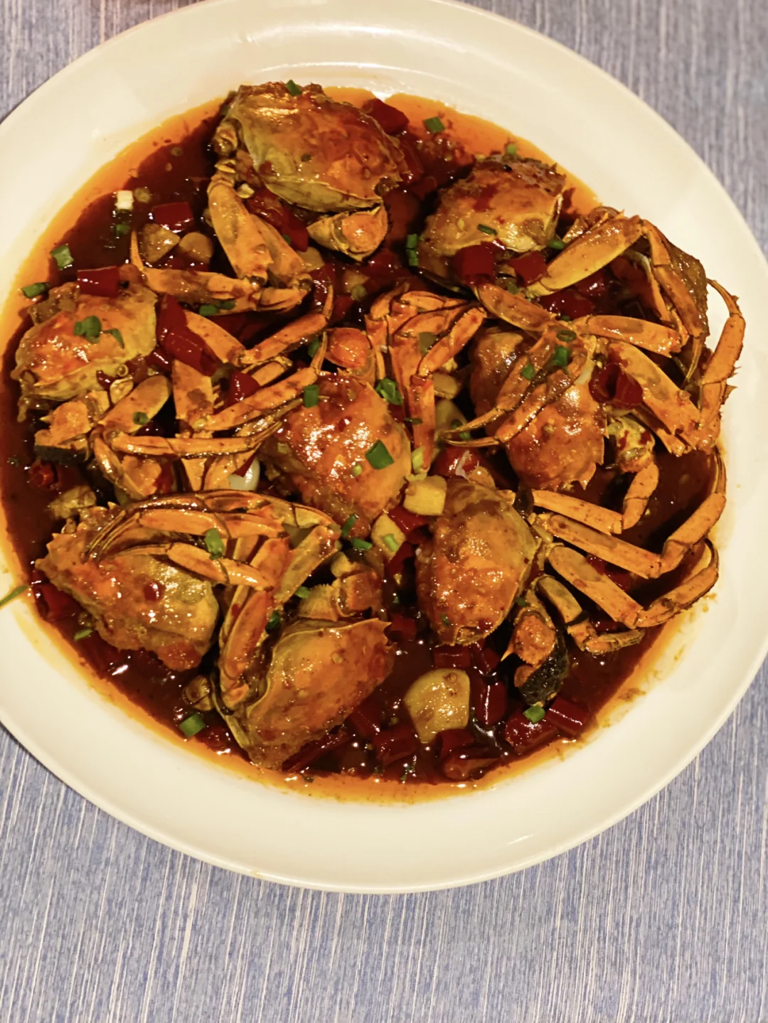 🦀️油焖大闸蟹:一只只可爱的大闸蟹摆盘精美,拿起手套抓起一只就吃起来,每吃一口满嘴都是膏黄,夹着蟹肉,是鲜辣可口的味道了。