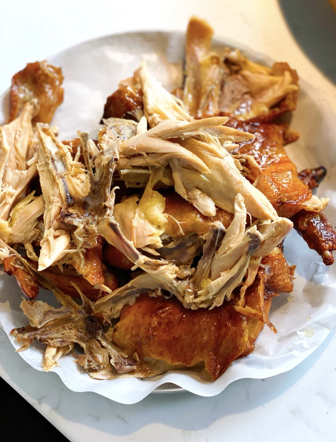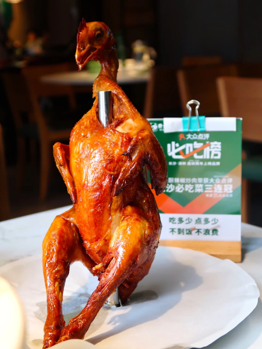 2⃣️柴火手撕鸡;🐔一整只黄金手撕鸡上桌,也太货真价实了叭~准备吃的时候可以叫服务员过来将这只鸡撕开分离,鸡肉连着皮一起撕下来吃超绝的😆外皮焦脆内里肉嫩有嚼劲,吃完饭还打包多一份回去来。