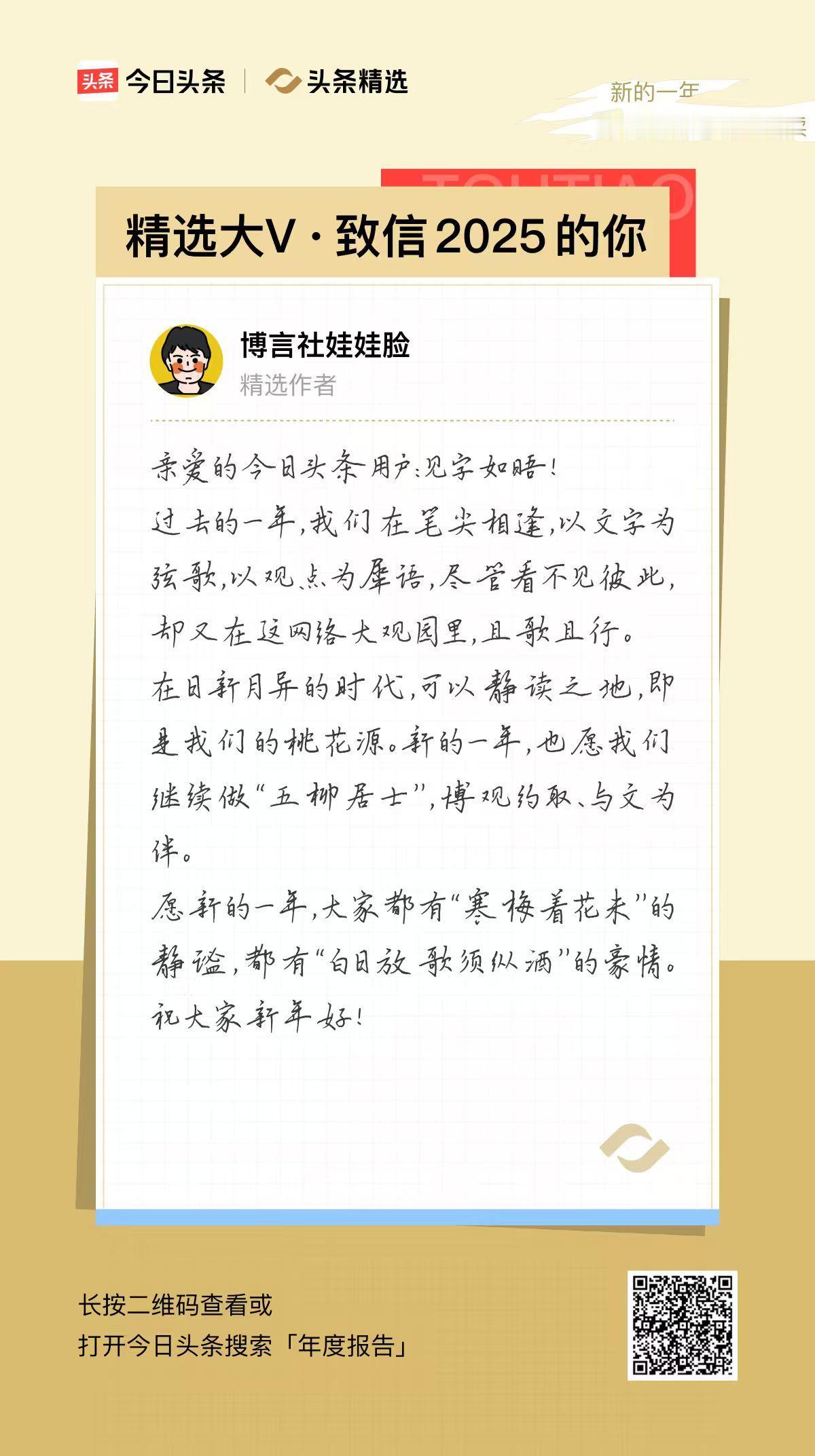 亲爱的今日头条用户:见字如晤! 过去的一年里,我们在笔尖相逢,以文字为弦歌,以观点为犀语,尽管看不见彼此,却又在这网络大观园里,且歌且行。 在日新月异的时代,可以静读之地,即是我们的桃花源。今年,我们在这桃花源里相见,新的一年,也愿我们继续做“五柳居士”,博观约取、与文为伴。 愿新的一年,每一位朋友,都有“寒梅着花未”的静谧,都有“白日放歌须纵酒”的豪情。祝大家新年好!