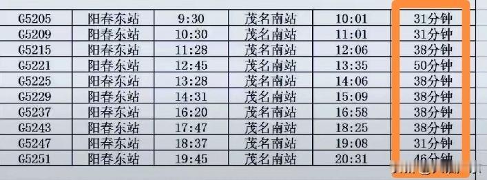 阳春东站至茂名南站,每日有10趟高铁往返! 从阳春东站搭乘高铁前往茂名南站,最快仅需31分钟(G5205、G5209次),最慢为46分钟(G5251次),车次从9:30至19:45陆续发车。此线路大幅缩短了阳春与茂名间的公路出行时间,将近三分之二的时长被压缩,成功打通了粤西两市的快速交通通道。 凭借这条高铁线路,阳春的农林特产能够迅速运往茂名市场,而茂名丰富的滨海旅游资源也会吸引更多阳春游客。它成为推动粤西内部产业协作、促进文旅资源互通的关键交通纽带,有力地助力了区域经济的协同发展。 粤西高铁站 罗定高铁北站 茂名高铁口 阳江至深圳高铁 电白高铁站 信宜高铁站 阳江至南宁高铁