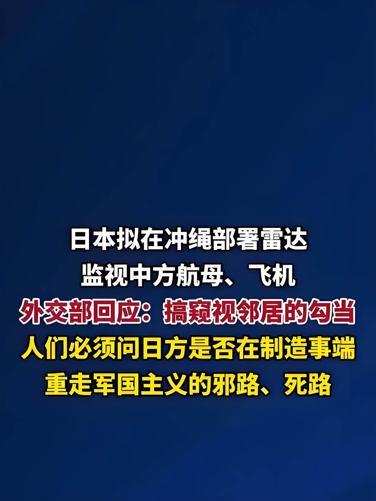 日本在冲绳装雷达盯中国航母?中方硬气回应:敢重走军国主义邪路?后果自负! 日本又搞小动作,这次直接把“监控器”架到中国家门口了!12月15日刚签完土地协议,就要在冲绳最东端部署移动雷达,专门盯着中国航母和战机在西太平洋的活动,2026年就启动,还派30人驻守,这波操作到底想干嘛?中方18日直接硬气回应,两连质问戳穿其真面目,看完只想说:别玩火! 先把事儿说透:日本选的位置太鸡贼了!冲绳最东端是中国海军进出太平洋的关键通道,相当于在咱们航母的必经之路装了个“360度无死角摄像头”。更过分的是,这不是孤立操作——之前日本就想在台海附近部署中程导弹,现在又加码雷达,加上首相高市早苗频频发表涉台错误言论,一套组合拳下来,明摆着是想制造事端、近身挑衅。 但日本忘了一个关键事实:中国航母的行动从来光明正大!这次辽宁舰编队西太训练,不仅没进日本领海领空,还提前通过国际频道公布训练区域,两次给附近的日本军舰通报计划,全程依法合规,专业到让日方挑不出毛病。反观日本,明知是中方训练空域,还派F-15战机蓄意抵近滋扰,反过来倒打一耙说中方“雷达照射危险”,纯属贼喊捉贼! 中方的回应更是一针见血,外交部发言人郭嘉昆直接戳穿其阴谋:“日方是不是在为自身扩军出海打掩护、找借口?是不是要重走军国主义的邪路、死路?” 这话可不是吓唬人——日本近年防卫预算连涨12年,今年更是冲到7.7万亿日元,一边喊着“应对威胁”,一边疯狂加码军事部署,历史的教训还没吸取够吗? 可能有人问:这跟咱们普通人有关系吗?当然有!冲绳是“第一岛链”关键节点,这里部署雷达,本质是想限制中国海军的正常活动,而咱们对外贸易90%靠海上运输,海域安全直接关系到物价稳定、贸易畅通。更危险的是,这种步步紧逼的挑衅容易引发误判,破坏地区和平,最后吃亏的还是老百姓。 网友们的眼睛都亮得很:“监控别人之前先看看自己,日本军国主义抬头才是最大威胁”“中方回应太霸气了,就该直接戳穿他们的小心思”“中国航母想练就在哪练,合法航行谁也管不着”! 其实日方心里门儿清,中国海军走向深蓝是大势所趋,辽宁舰、山东舰双航母编队常态化远海训练,实力摆在这,一个雷达根本挡不住。中方的强硬回应,既是捍卫合法权益,也是在提醒日方:别高估自己的实力,别低估中方捍卫主权的决心。
