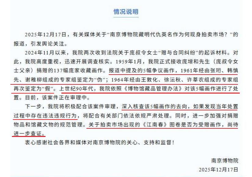 网友们真的太厉害了,南京博物院还是请网友们帮忙调查吧,网友们比你们都知道那不知踪影的5部古画去了哪里。 有网友给我留言贴了一张截图,是2014年嘉泰拍卖公司拍卖的宋代赵光辅《双马图轴》,这就对上了,这是南京博物院发情况通报当年鉴定为“假画”的五部古画之一,而且人家拍卖公告信息上都说了,藏品上有最后一任藏家庞莱臣的印章。 据了解,2014年嘉泰拍卖公司拍卖赵光辅《双马图轴》成交价格是230万元,那么现在问题来了,2014年嘉泰拍卖公司接受了谁的委托拍卖出去的。 1961年、1964年南京博物院两次专家鉴定,将仇英《江南春》图卷、赵光辅《双马图轴》、王绂《松风萧寺图轴》、王时敏《仿北苑山水轴》、汤贻汾《设色山水轴》五部古画鉴定为“伪作”,而这五部古画恰恰就是庞莱臣儿子庞增和先生1959年捐赠给南京博物院的137件古画中的5部画作。 接下来估计网友们会帮助庞莱臣后人找出另外三部从南京博物院消失的古画到底去了哪里,本来这些事情对南京博物院来说最容易说出到底把古画给了谁,但是南京博物院去在情况通报里不敢说出来,大家说这是为什么呢?