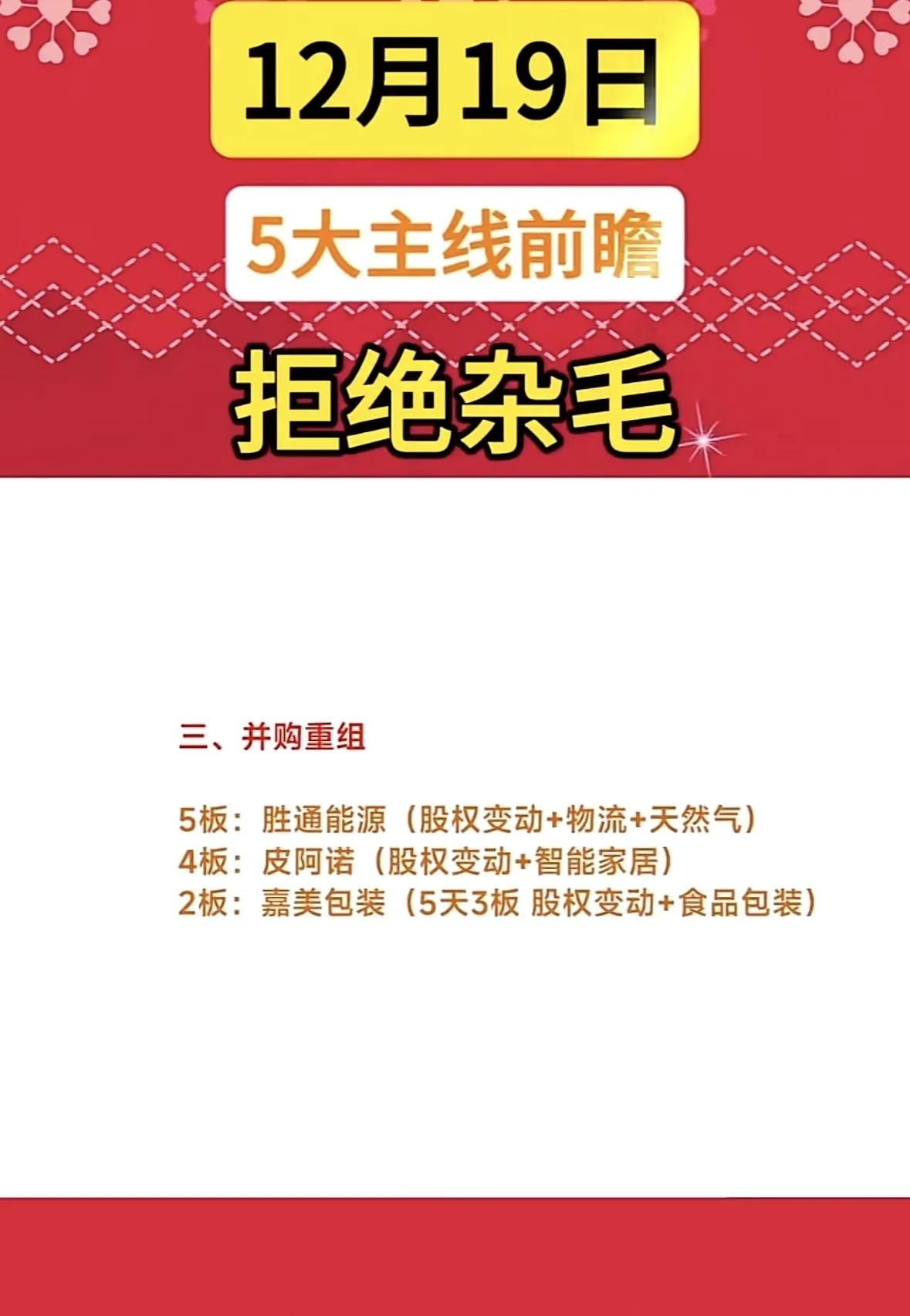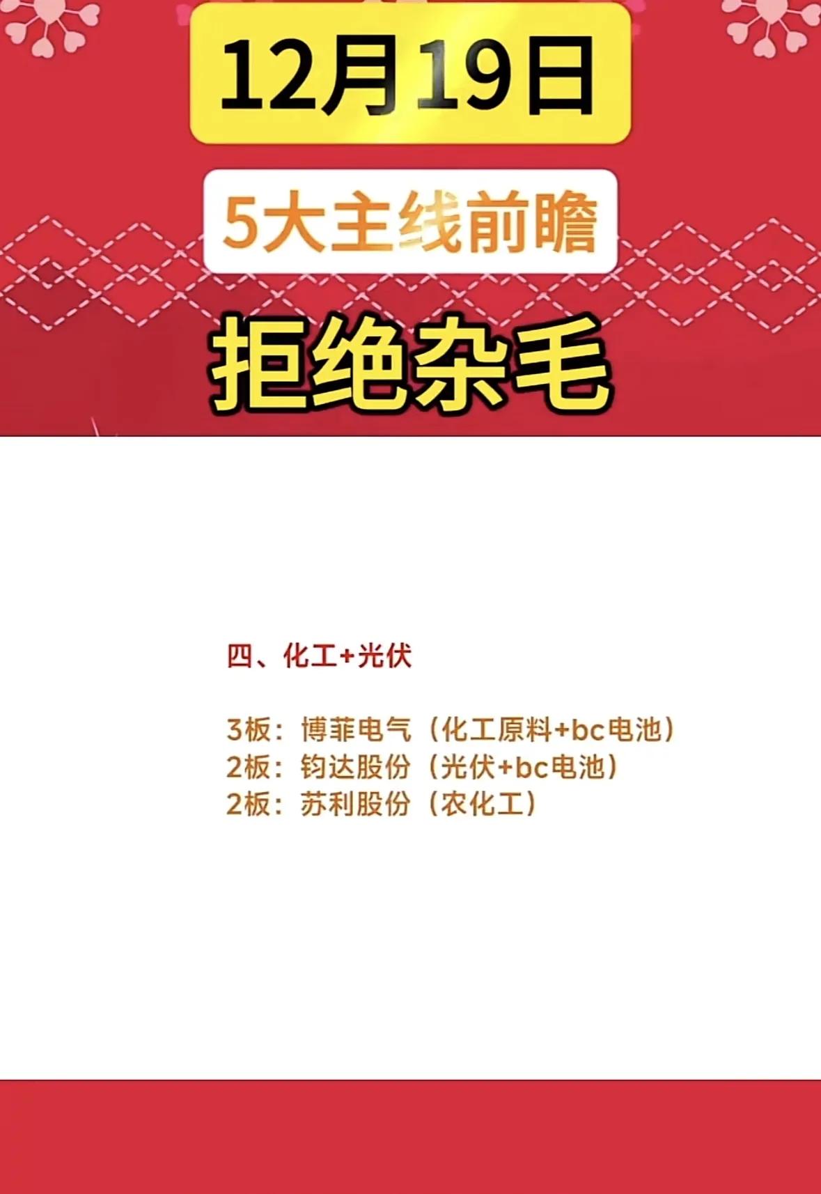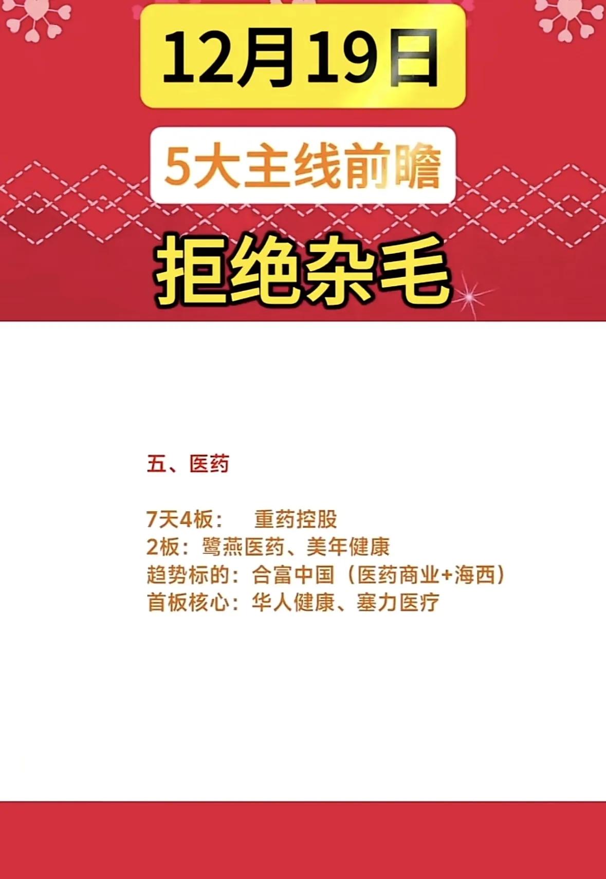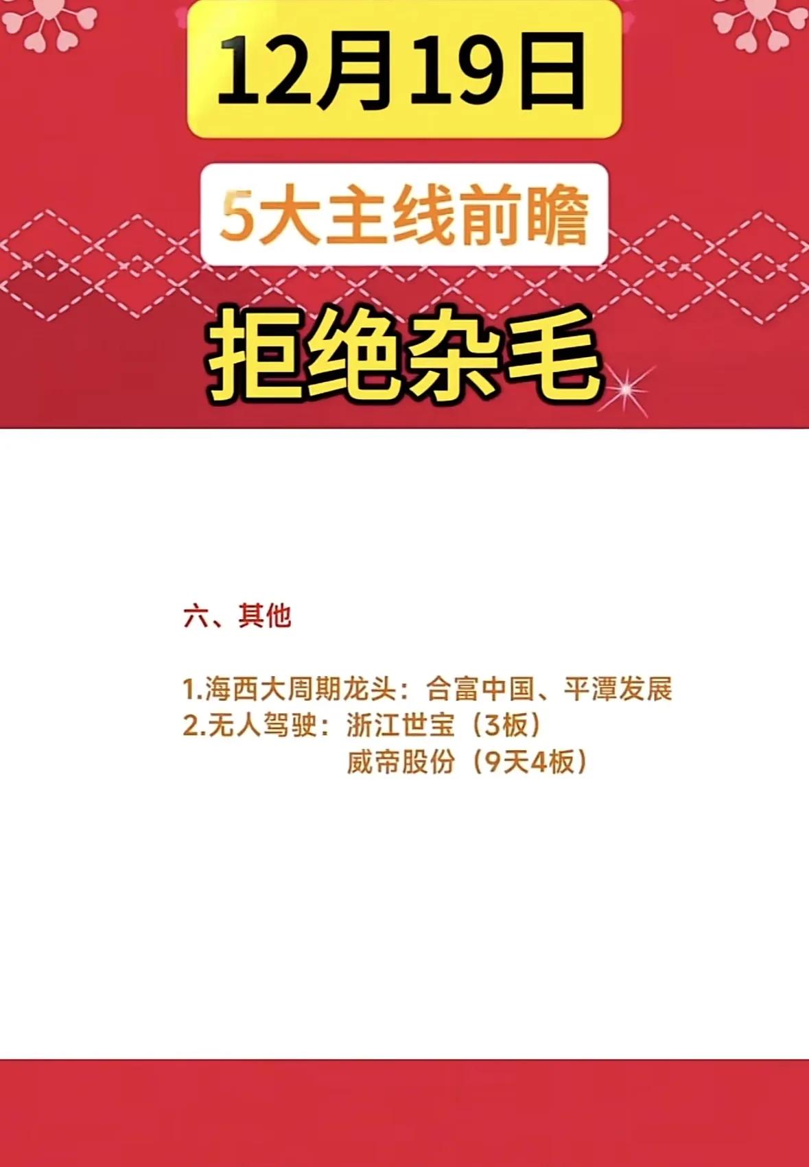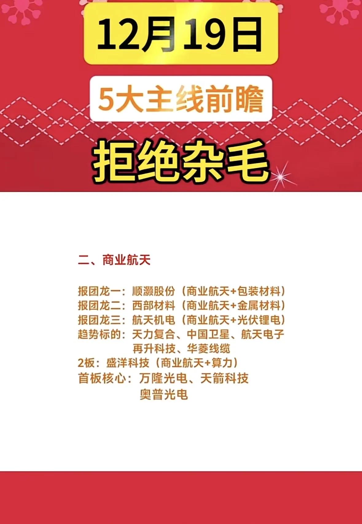 “5大主线前瞻”,梳理了六大板块的重点股票信息: 一、大消费板块:情绪龙头为东百集团(海西+商业连锁),容量中军是永辉超市;6板的百大集团为小周期核心,4板的皮阿诺涉及股权变动+智能家居,3板的利群股份覆盖商业连锁+智能物流,2板的嘉美包装(食品包装+股权变动)、庄园牧场(食品饮料+乳业)、立达信(家电+芯片+海西)各有概念叠加;此外还有9天5板/2板的南京商旅(旅游贸易)、8天4板/3天2板的皇氏集团(食品饮料)、中央商场(商业连锁),5天3板的九牧王(服装+海西),以及首板核心来伊份、上海九百、广博股份。 二、商业航天板块:报团龙一为顺灏股份(商业航天+包装材料),报团龙二是西部材料(商业航天+金属材料),报团龙三为航天机电(商业航天+光伏锂电);趋势标的包括天力复合、中国卫星、航天电子、再升科技、华菱线缆;2板的盛洋科技(商业航天+算力),首板核心为万隆光电、天箭科技、奥普光电。 三、并购重组板块:5板的胜通能源涉及股权变动+物流+天然气,4板的皮阿诺(股权变动+智能家居),2板的嘉美包装为5天3板且覆盖股权变动+食品包装。 四、化工+光伏板块:3板的博菲电气(化工原料+bc电池),2板的钧达股份(光伏+bc电池)、苏利股份(农化工)。 五、医药板块:7天4板的重药控股,2板的鹭燕医药、美年健康,趋势标的合富中国(医药商业+海西),首板核心华人健康、塞力医疗。 六、其他板块:一是海西大周期龙头合富中国、平潭发展;二是无人驾驶板块,3板的浙江世宝、9天4板的威帝股份。