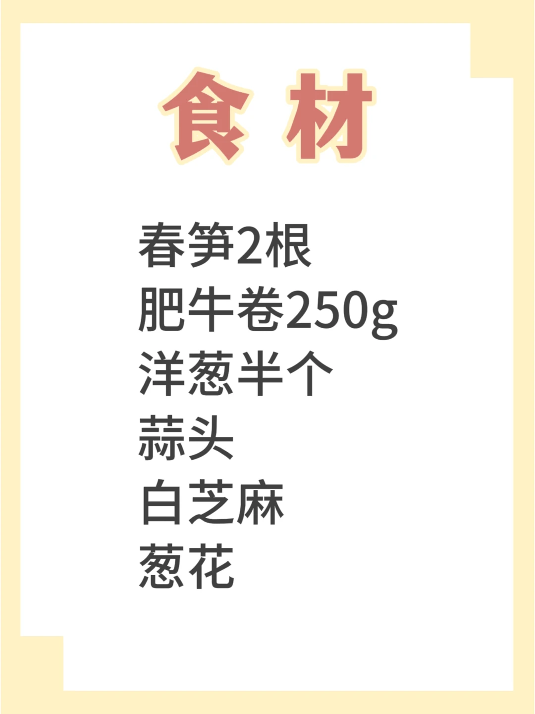 [清单R]原料:春笋2根、肥牛卷250g、洋葱半个、蒜头、白芝麻、葱花