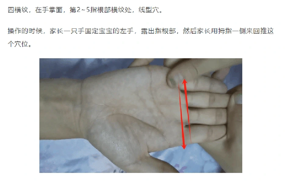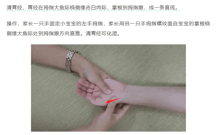 ☯️☯️可以搭配小儿推拿。清大肠5分钟、清胃经穴10分钟、清补脾10分钟、推四横纹5分钟,还有顺时针摩腹。(如图)