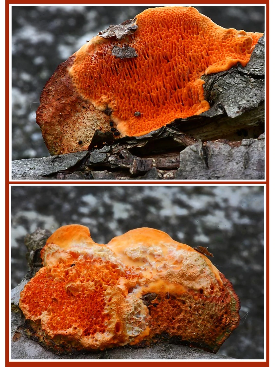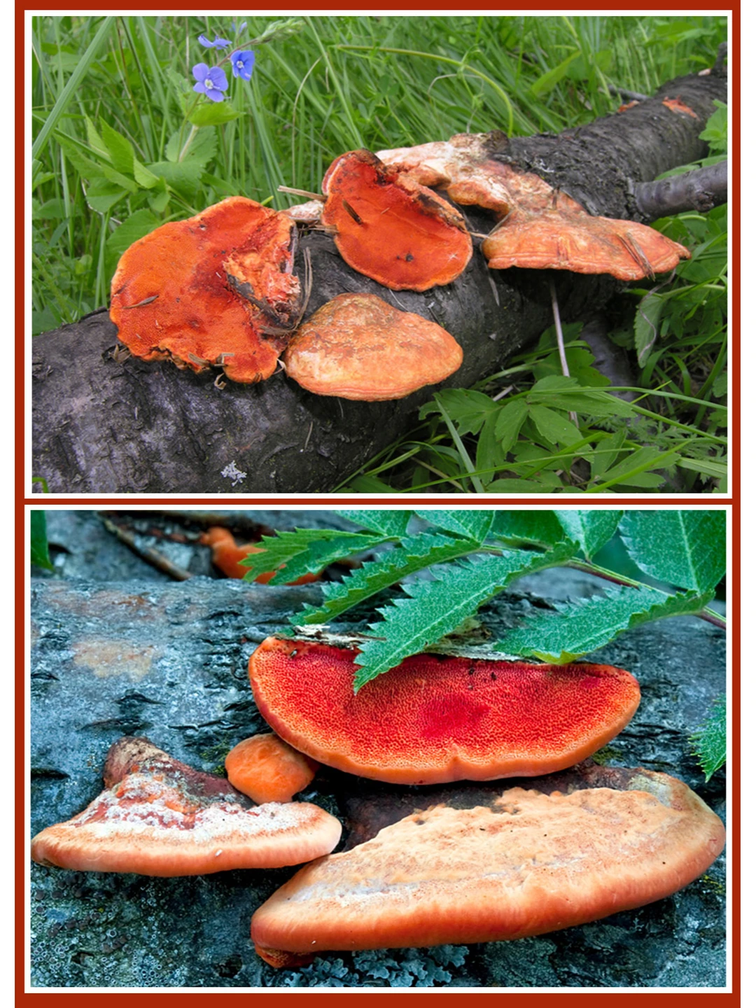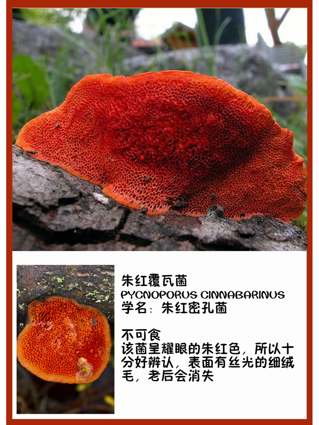 朱红覆瓦菌 Pycnoporus cinnabarinus 学名:朱红密孔菌 不可食 该菌呈耀眼的朱红色,所以十分好辨认,表面有丝光的细绒毛,老后会消失