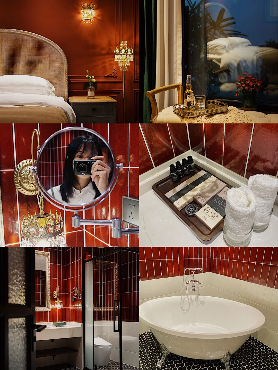 🌾整栋民宿给我的感觉是穿越到巴厘岛度假,打开房门就像推开了多啦A梦任意门,马上又穿越到南法的错觉。我预定的是法式风格的房型,红色复古风比想象中惊艳,我光着脚在地板上走觉得超滑,民宿主理人老王是CCTV特邀设计师,他告诉我地面用的是意大利手工地砖,都是一块块手工拼砌而成,床垫用是万豪洲际希尔顿这些五星酒店用的席梦思床垫,睡一晚像躺在棉花上一样柔软舒服~