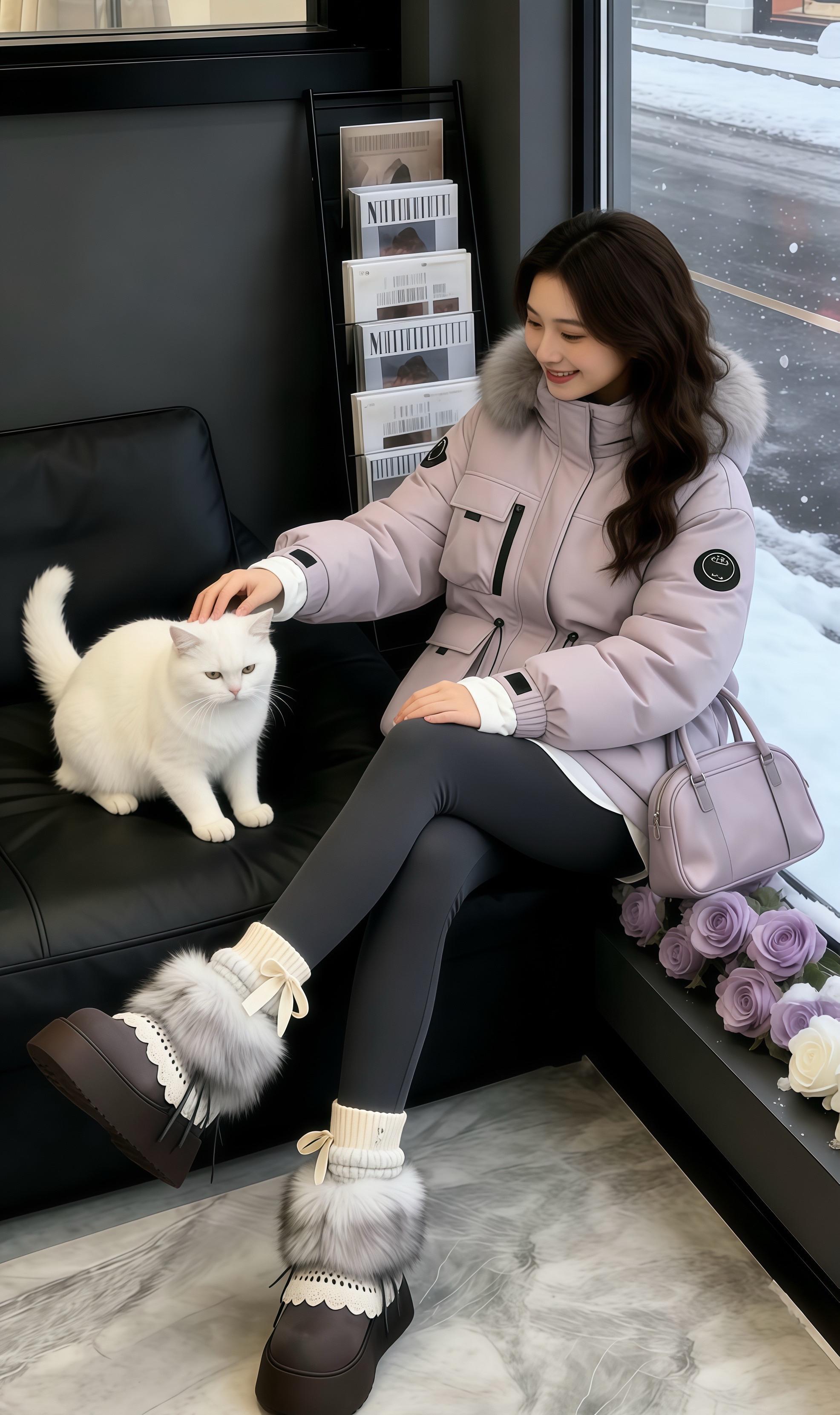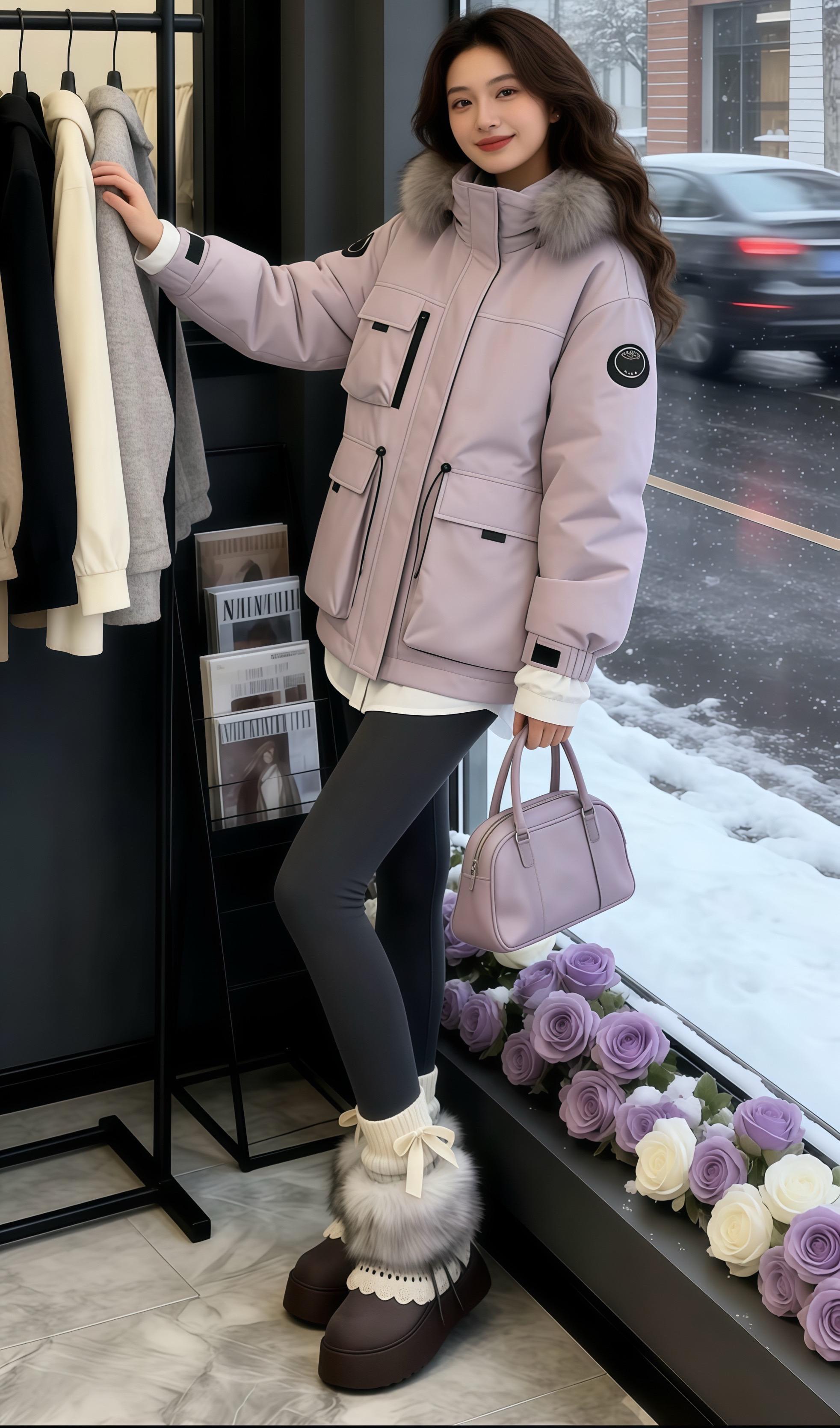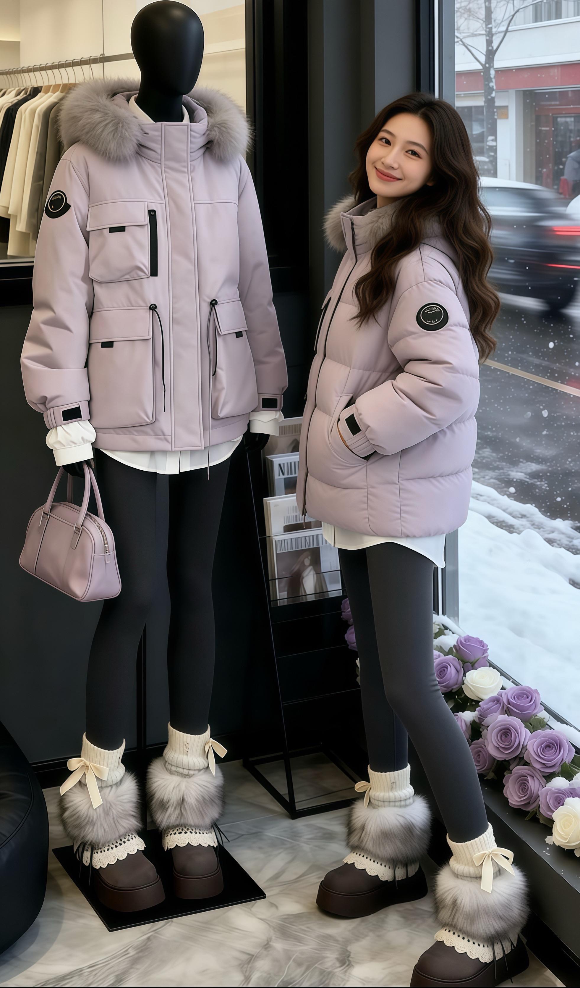 冬日探店甜酷风拿捏!内搭白衬衫+深灰紧身裤利落显瘦,带毛边蕾丝的厚底雪地靴踩出元气,浅紫手提包点睛超吸睛~羽绒服毛领蓬松软糯,冷调店铺里穿出精致松弛感,逛街出片两不误✨多色可选
