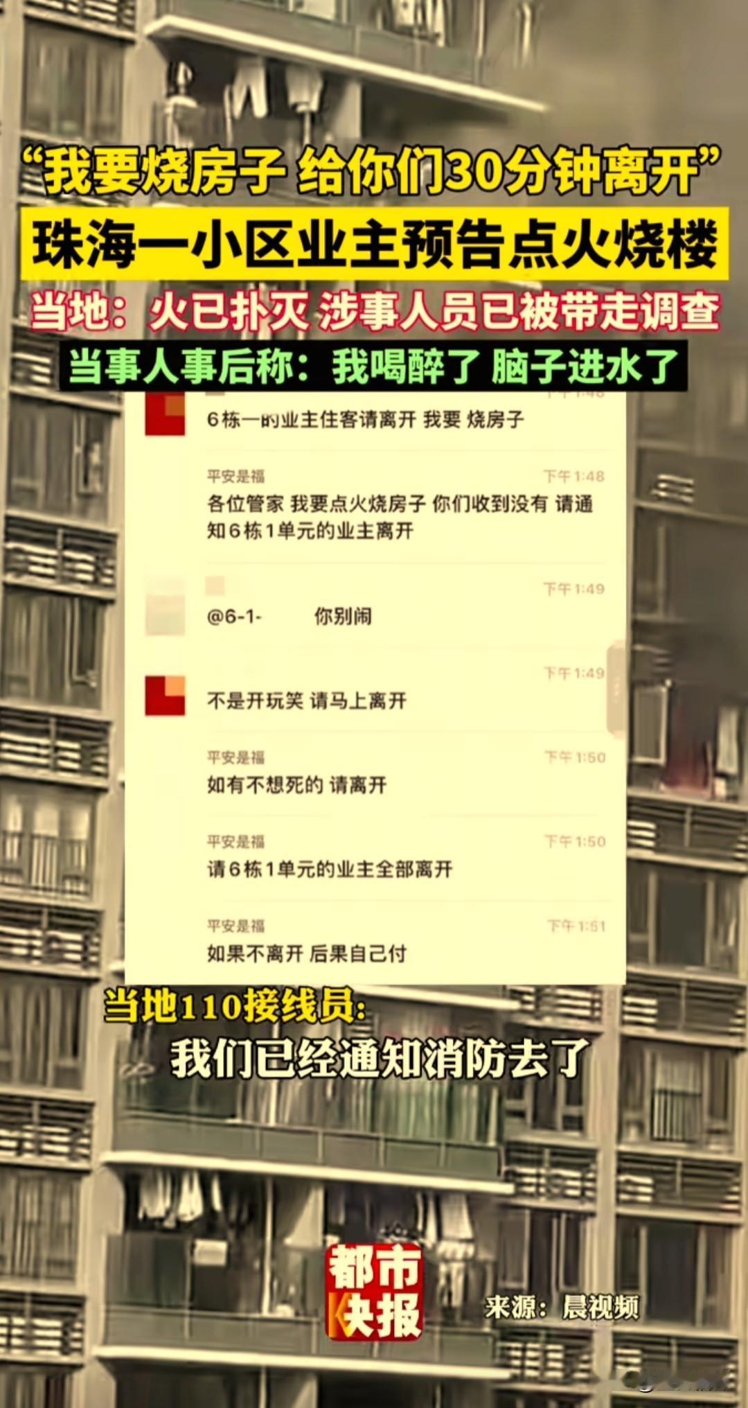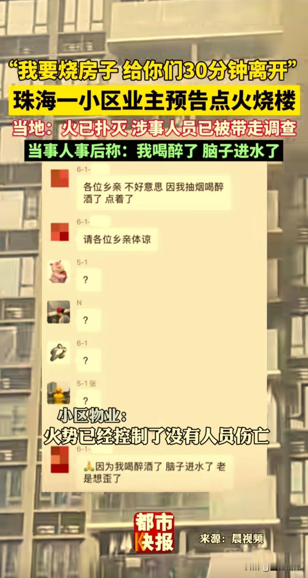 广东珠海一男子在业主群里发消息通知邻居,说我要烧房子,给你们30分钟离开,不离开我就点火了。当地回应已经出警,火扑灭了,男子事后回复说,他喝醉了,脑子进水了。 据多家媒体报道,12月8日,在广东珠海香洲区南屏镇一小区,一名业主在群里发消息,让6栋1单元的业主们离开,他要烧房子,还发了一张家中铺满被子的照片。 物业人员看到后赶到这名业主家门口,这个业主在群里说:“已经烧起来了,你们不走不管我的事呀”,还发了烧起来的照片。 珠海市119指挥中心接到火灾报警后,赶到了现场处置,明火很快被扑灭,这名业主在群里发消息说:“各位乡亲,不好意思,因为我抽烟喝醉了,点着了”。 火被扑灭后,这名男子被物业人员和住户控制住并移交了警方。