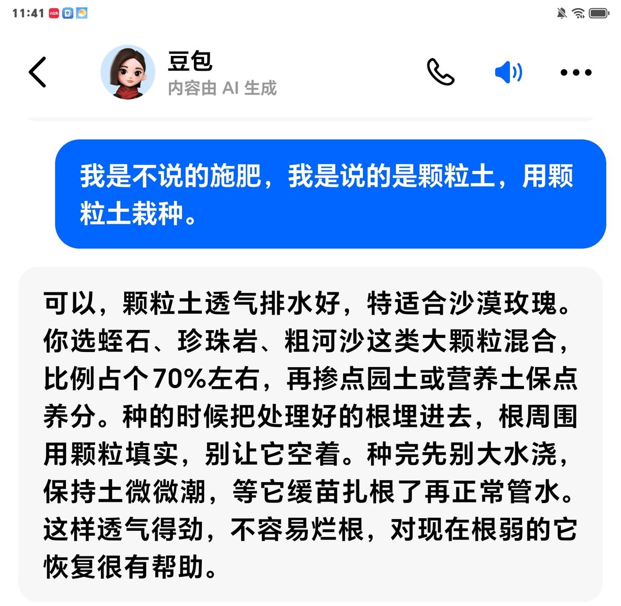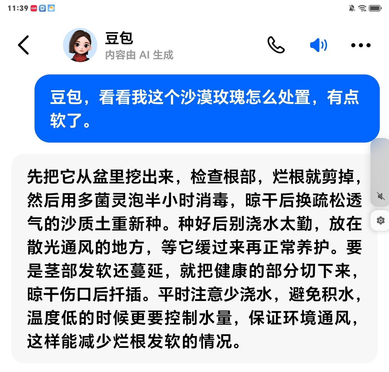 分享我这周有趣的事: 这周我的一棵《沙漠玫瑰》的枝干一掐就软了,我在没好办法的情况下就试着问了问《豆包》,《豆包》给我讲的很仔细,我也很好奇,我只用手机对着沙漠玫瑰,她就知道我的《沙漠玫瑰》应该怎么处理,照着她的话去做,果真我的沙漠玫瑰枝扞真的又挺了起来。希望没有《豆包》的友友们,要想解决疑难问就下载个《豆包》吧!她360行,行行都精通[给力][给力][给力] 请看图片:
