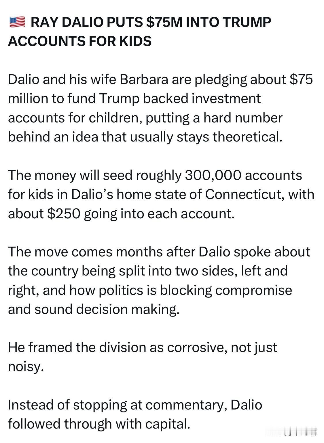 突发消息:亿万富翁雷·达里奥和他的妻子芭芭拉将向特朗普的儿童账户慷慨捐赠约 7500 万美元,为康涅狄格州的 30 万名儿童每人提供约 250 美元。 达利欧在𝕏中写道:“这些特朗普的儿童账户很棒,不仅因为它们为这些年轻人投资股票,还因为它们让他们关注金融、股票、公司和资本主义如何运作以改善社会并为他们服务。”
