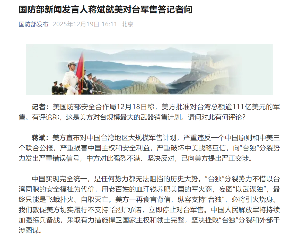 【#国防部回应美111亿对台军售#】#台独势力用百姓血汗钱养肥美军火商#记者:美国防部安全合作局12月18日称,美方批准对台湾总额逾111亿美元的军售。有评论称,这是美方对台规模最大的武器销售计划。请问对此有何评论?蒋斌:美方宣布对中国台湾地区大规模军售计划,严重违反一个中国原则和中美三个联合公报,严重损害中国主权和安全利益,严重破坏中美战略互信,向“台独”分裂势力发出严重错误信号,中方对此强烈不满、坚决反对,已向美方提出严正交涉。中国实现完全统一,是任何势力都无法阻挡的历史大势。“台独”分裂势力不惜以台湾同胞的安全福祉为代价,用老百姓的血汗钱养肥美国的军火商,妄图“以武谋独”,最终只能是飞蛾扑火、自取灭亡。美方一再食言背信,纵容支持“台独”,必将引火烧身。我们敦促美方切实履行不支持“台独”承诺,立即停止对台军售。中国人民解放军将持续加强练兵备战,采取有力措施捍卫国家主权和领土完整,坚决挫败“台独”分裂和外部干涉图谋。