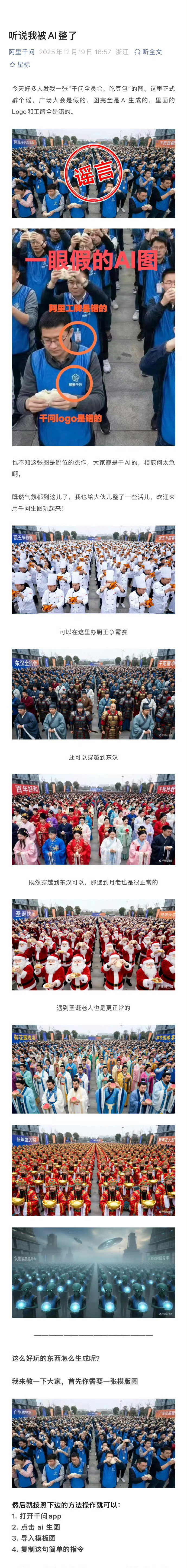 #阿里千问开全员会标语干死豆包系谣言##阿里千问辟谣全员大会吃豆包图# 这事就挺诡异的,互联网圈疯传一张图“阿里千问全员大会,举着一个豆包,一边喊干死豆包一边掰成两半吃掉“。很快啊,千万官方就辟谣了,该图也是由ai生成。还调侃说“听说我被AI整了?既然气氛都到这儿了,我也给大伙儿整了一些活儿。这事好笑的地方在于,一个AI企业,被AI给造谣了。哈哈哈哈,千问挺有幽默精神的,直接秀了一把ai时代自己吃自己瓜的姿势,自己玩自己的梗,顺便还给自己引了一把流量。但是这个事儿让我想到,为什么一张AI图,骗过了很多网友,可能核心因素还是现在的AI技术高度成熟,生成的图片高度逼真。可以预测未来一段时间类似的谣言会很多,因为造谣成本太低了,只需要用AI助手几秒钟就能生成一张图片。我觉得一方面AI平台必须注明作品是AI生成的,另外就是咱们网友不要轻信很多,尽量以官方发布为准,同时也要善于求证。毕竟,因为AI图片被处罚的人也不在少数。