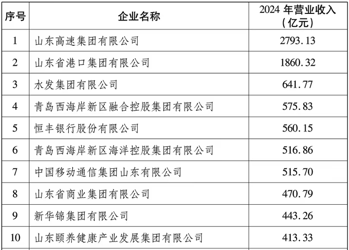 从营收情况看,山东服务业企业50强总营收约1.49万亿元。其中,山东高速集团以2793.13亿元的营收位列第一,山东省港口集团位列第二。水发集团、青岛西海岸新区融合控股集团有限公司、恒丰银行分别位列第三、四、五名。