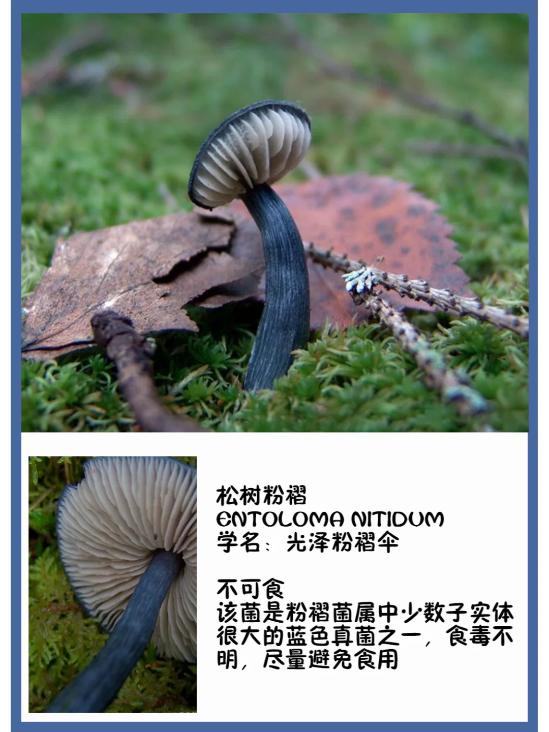 松树粉褶 entoloma nitidum 学名:光泽粉褶伞 不可食 该菌是粉褶菌属中少数子实体很大的蓝色真菌之一,食毒不明,尽量避免食用