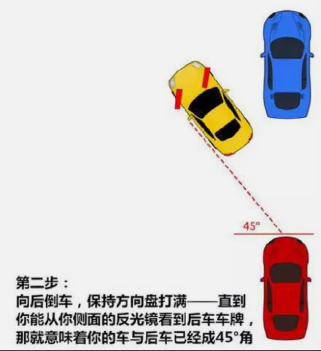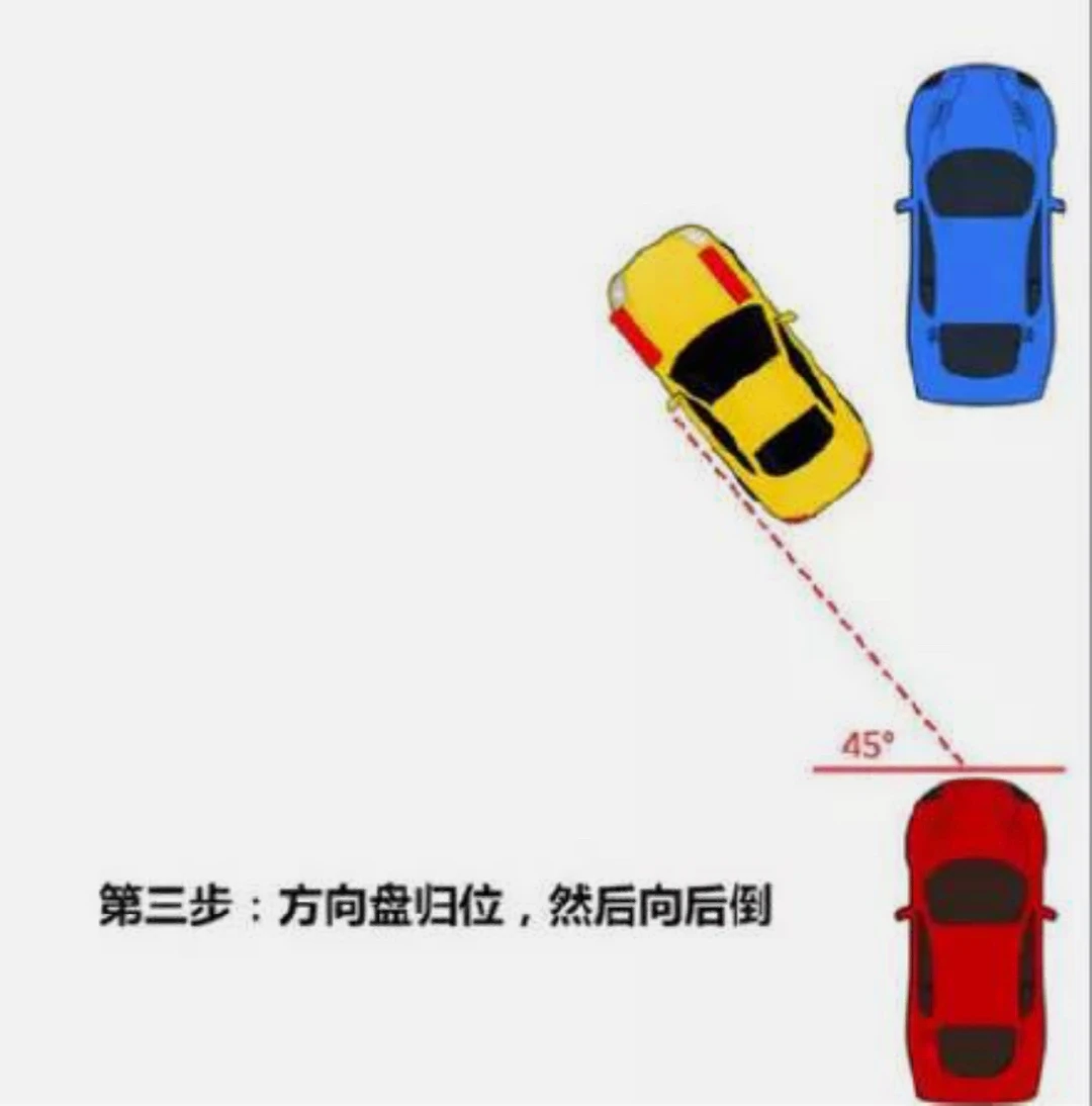 2⃣️方向盘向右打满,倒车,直到左后视镜能看到后车车牌/后车右灯/库角(图3)
