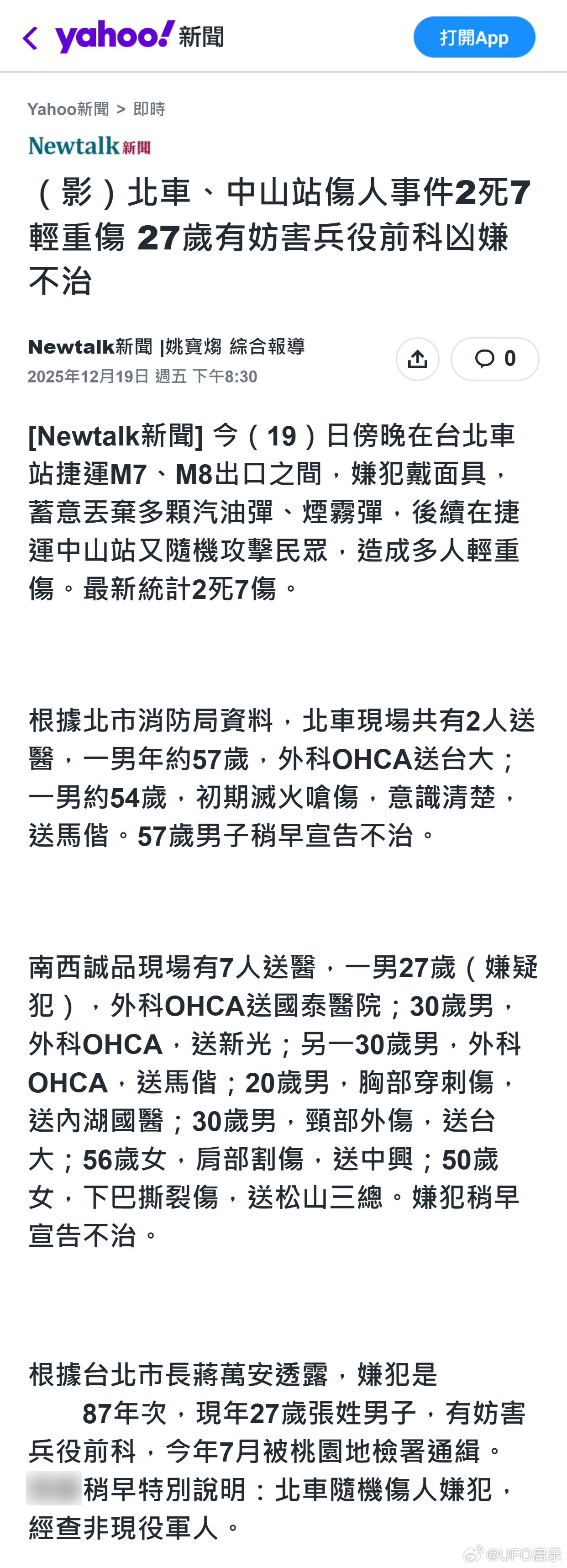 台媒:北车、中山站伤人事件2死7轻重伤 27岁有妨害兵役前科凶嫌不治