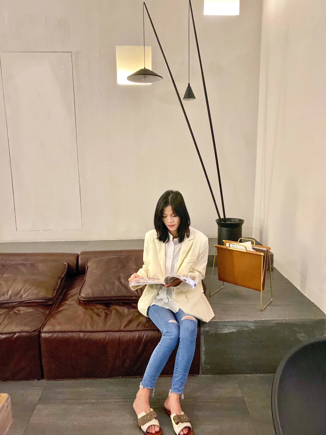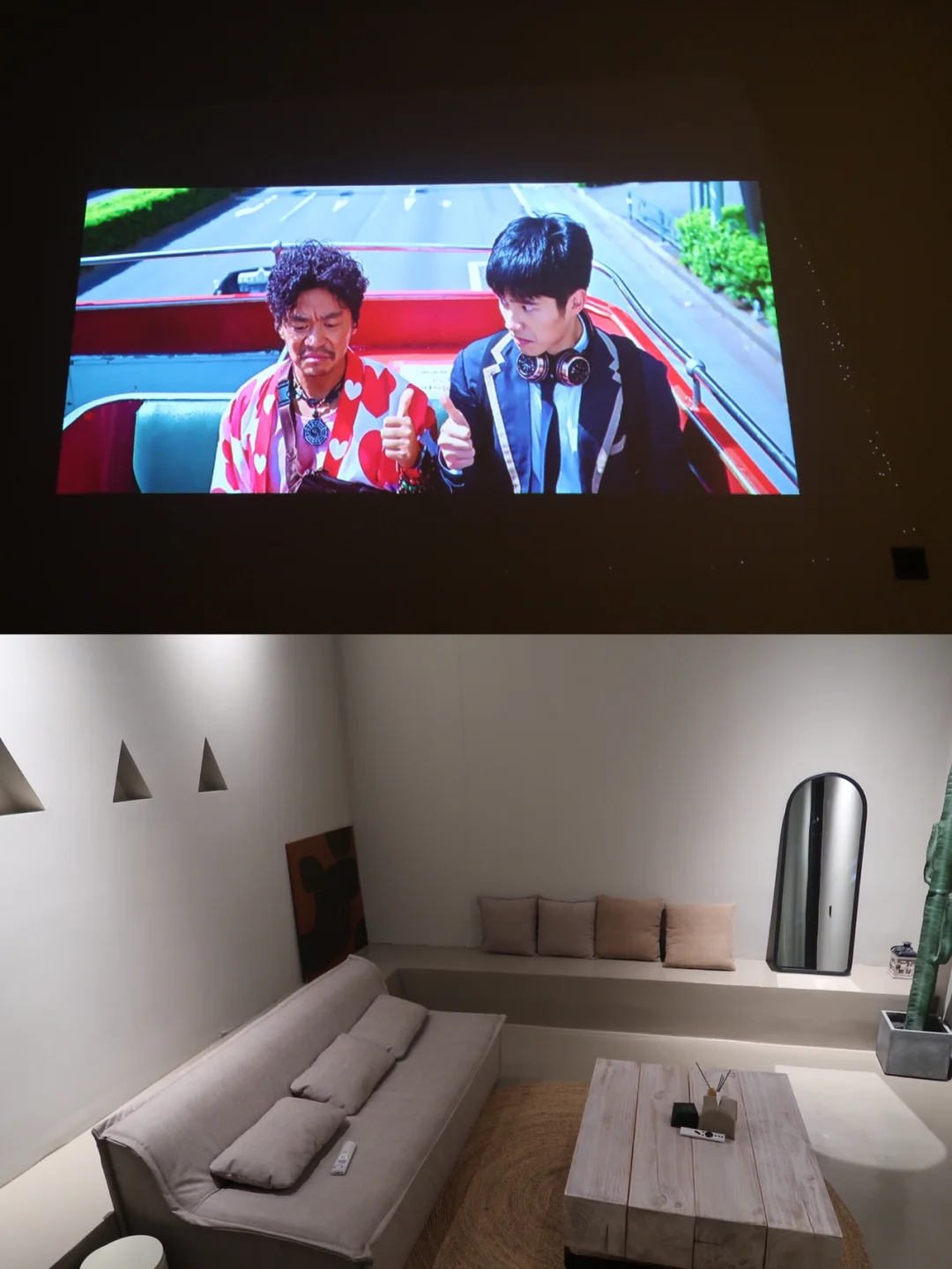 🥰当我按住墙面上的开关的时候,窗帘刷刷刷自动拉开,推开庭院的大门能看到一个灰色的沙发,对面标配一个超大的电视屏幕,阶梯上零零散散的排列着几个枕头和仙人掌搭配一个黑色的落地镜✨这简直就是我心中想要的小型电影院模样!